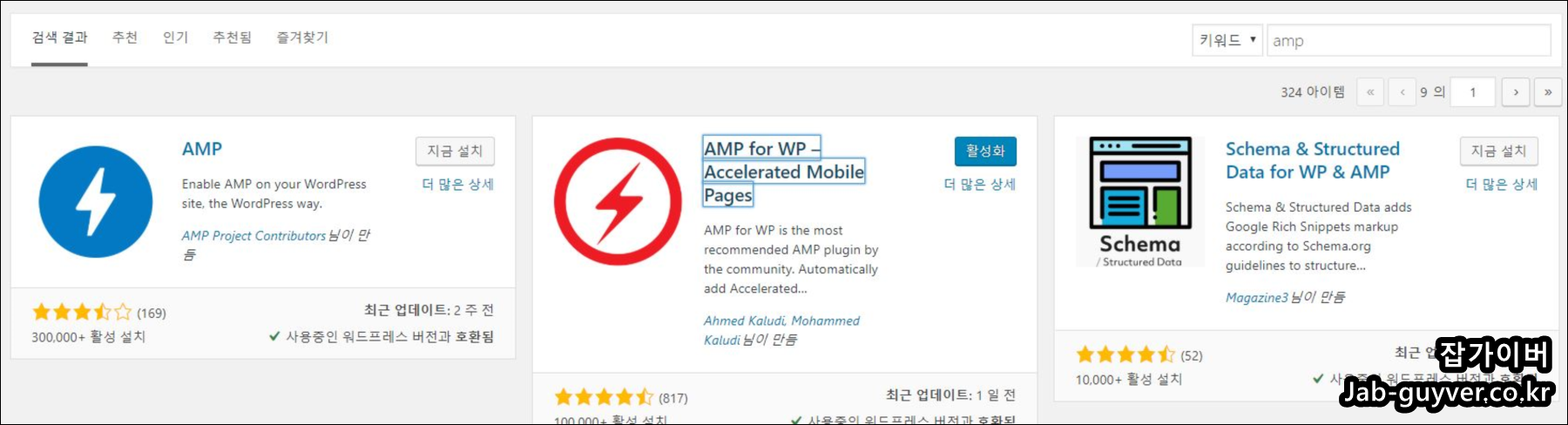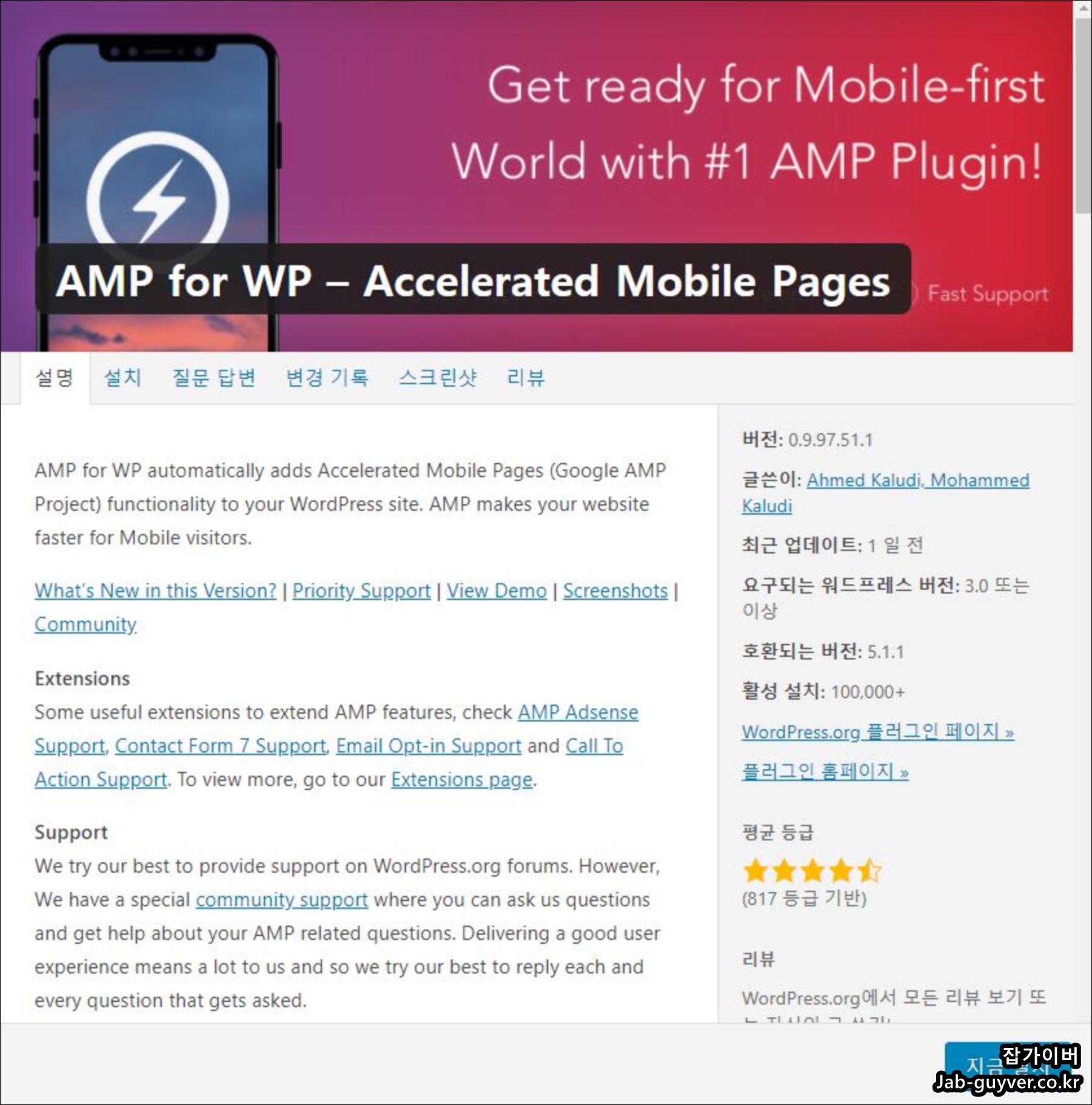 워드프레스 플러그인 검색에서 AMP for WP – Accelerated Mobile Pages를 찾으면 이 플러그인을 설치할 수 있습니다. 이름 그대로 모바일용 AMP 페이지를 자동으로 만들어 주는 플러그인이라, 별도 테마를 쓰지 않고도 AMP 버전을 제공할 수 있다는 점이 편합니다.