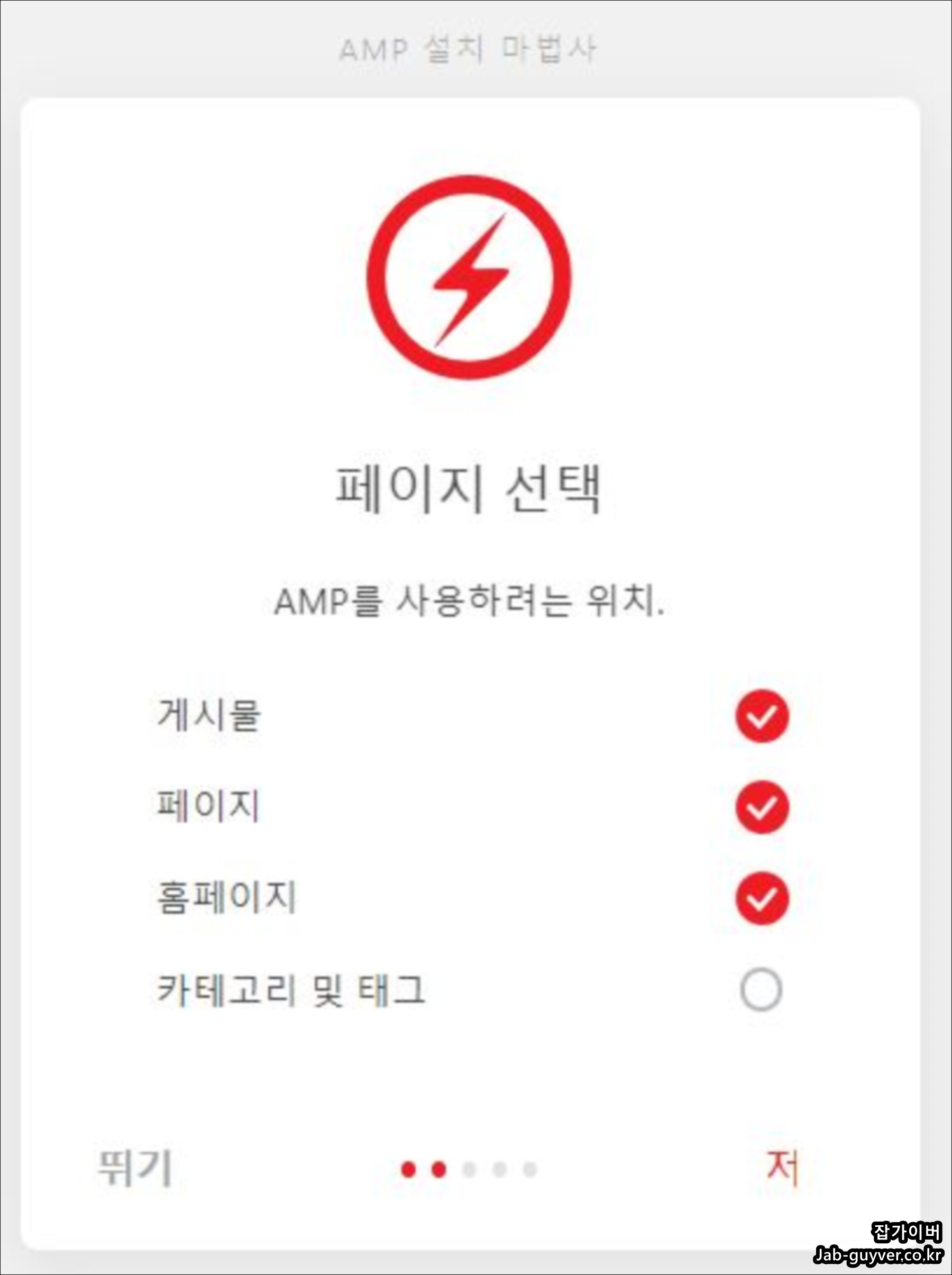 위처럼 환영 화면을 지나면 어떤 콘텐츠를 AMP로 제공할지 고르는 부분이 나옵니다. 게시물만 AMP로 할지, 페이지와 카테고리까지 AMP 버전을 함께 제공할지 선택할 수 있는데, 저는 블로그 글 중심 사이트라 게시물 · 카테고리 · 홈페이지를 모두 켜두고 쓰고 있습니다.