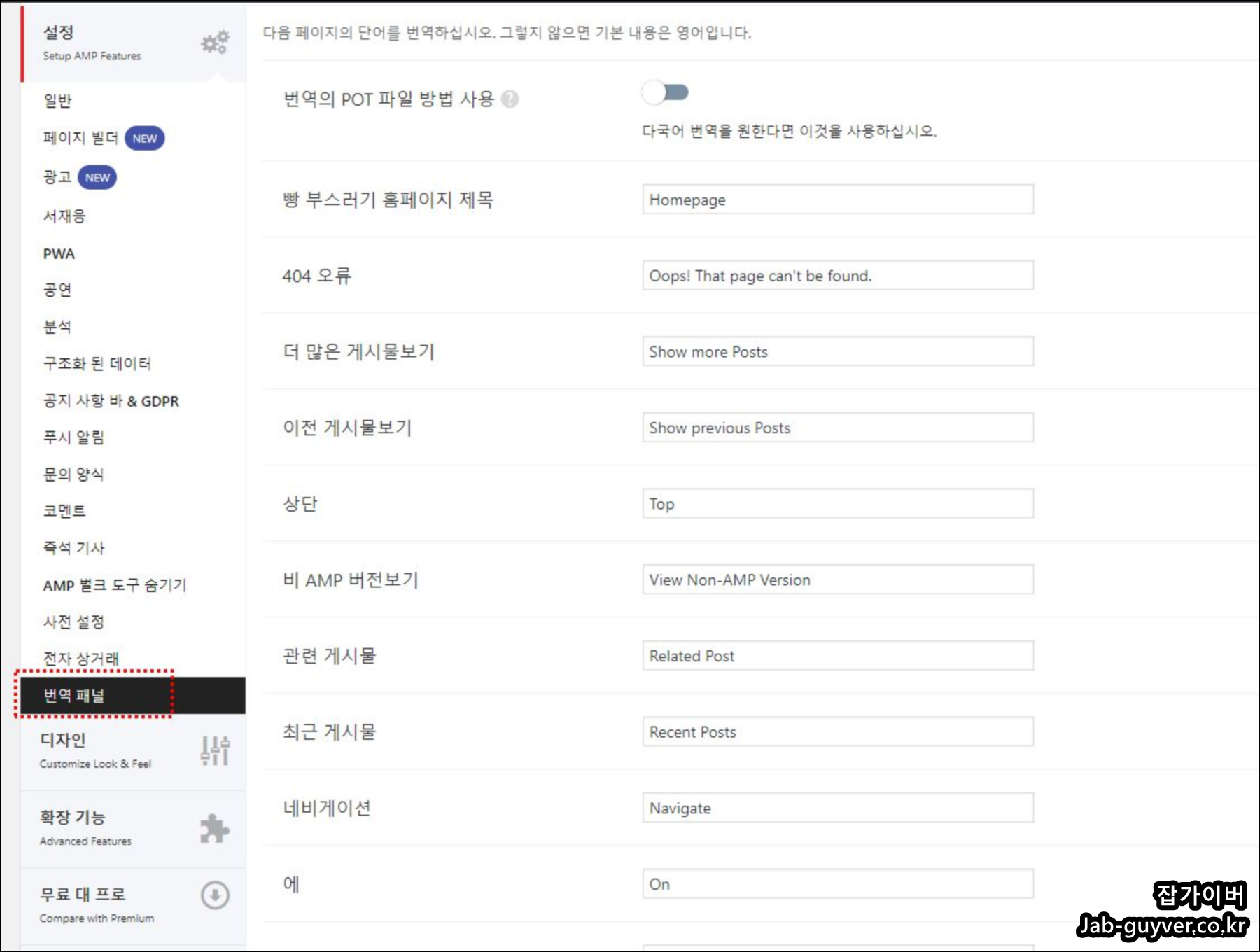 AMP for WP 메뉴에서 번역 패널을 열면 기본으로 들어 있는 영문 텍스트를 모두 한글로 바꿀 수 있습니다. 404 페이지, 검색 결과 없음, 댓글 관련 문구 등 자주 노출되는 문장을 사이트 분위기에 맞춰 바꿔 두면, 문제가 생겨도 방문자가 훨씬 차분하게 페이지를 이용하는 데 도움이 됩니다.