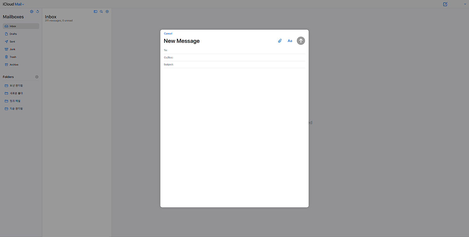 기존 iCloud Mail은 새로운 창에서 메일을 작성해야했지만 새로운 iCloud Mail은 동일한 창에서 팝업되어 메일을 작성할 수 있습니다