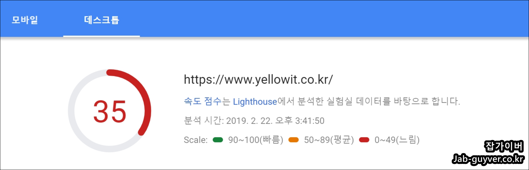 모바일 점수는 10점 데스크톱 점수는 35점으로 매우 느린 속도를 보여주는 상태입니다.