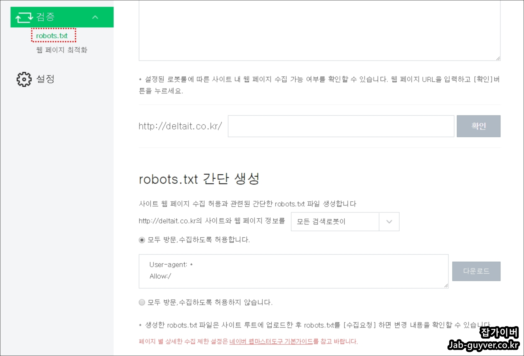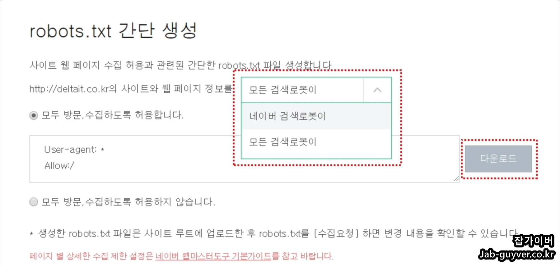 참고로 robots.txt 파일은 네이버 웹마스터도구에서도 다운로드할 수 있습니다.