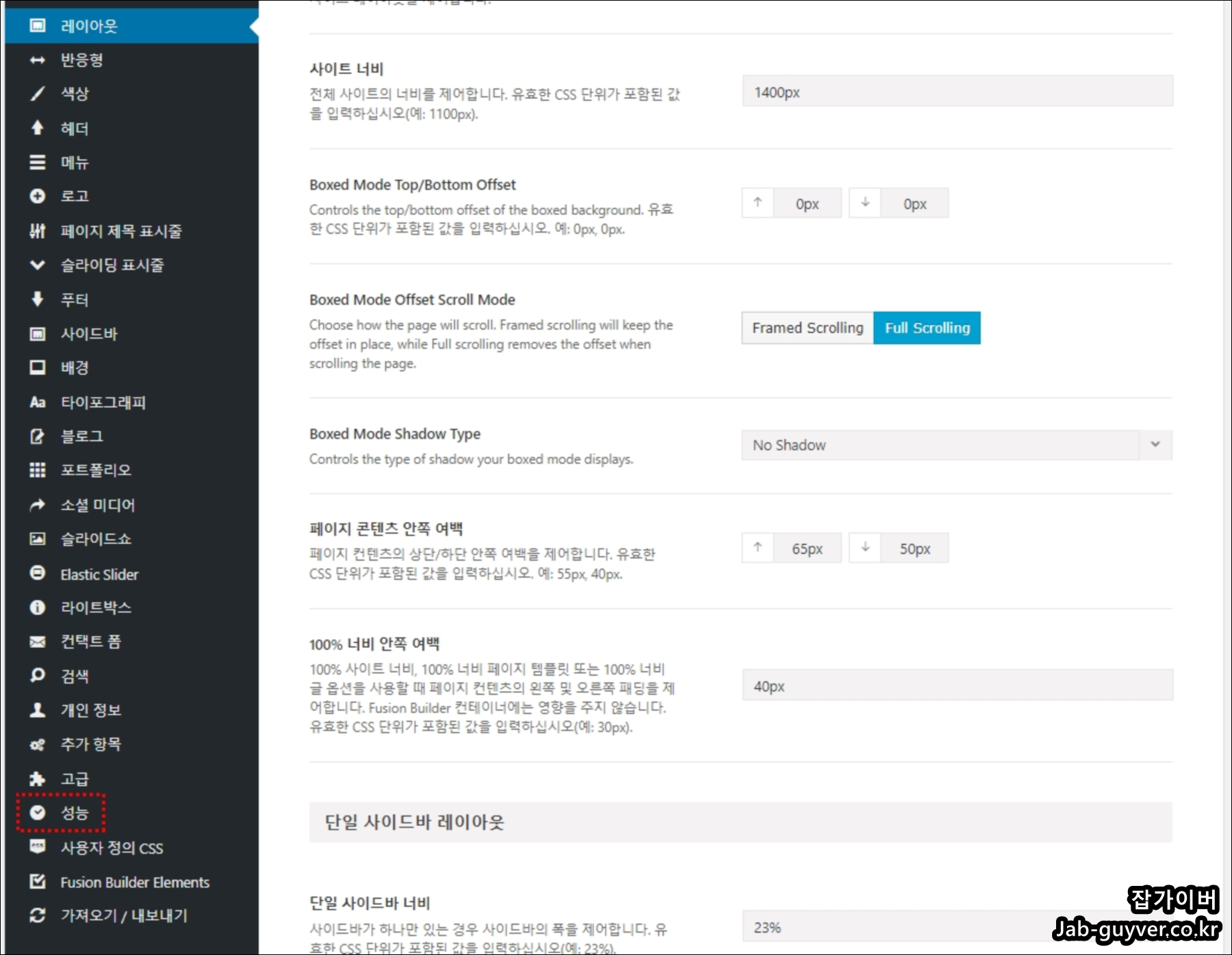 성능탭에서는 이동을 했다면 아바다 테마를 가볍게 해줄 수 있는 설정값을 체크해 주는것이 좋습니다.