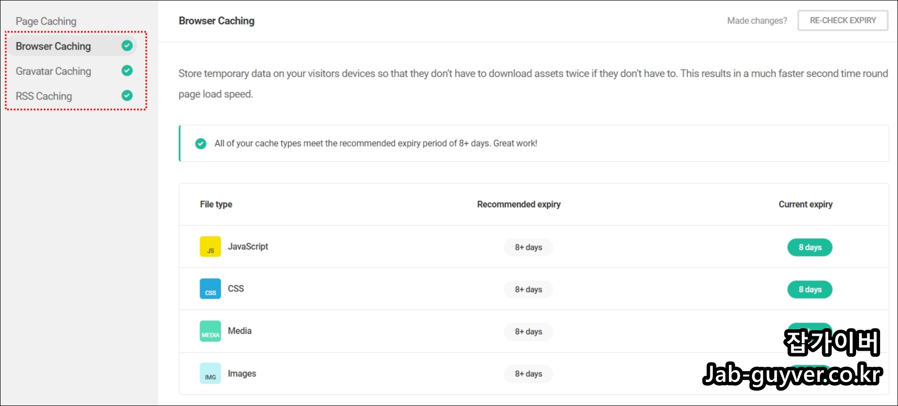 이렇게 브라우저캐싱과 그라비팅캐싱,RSS캐싱등을 활성화해줍니다.