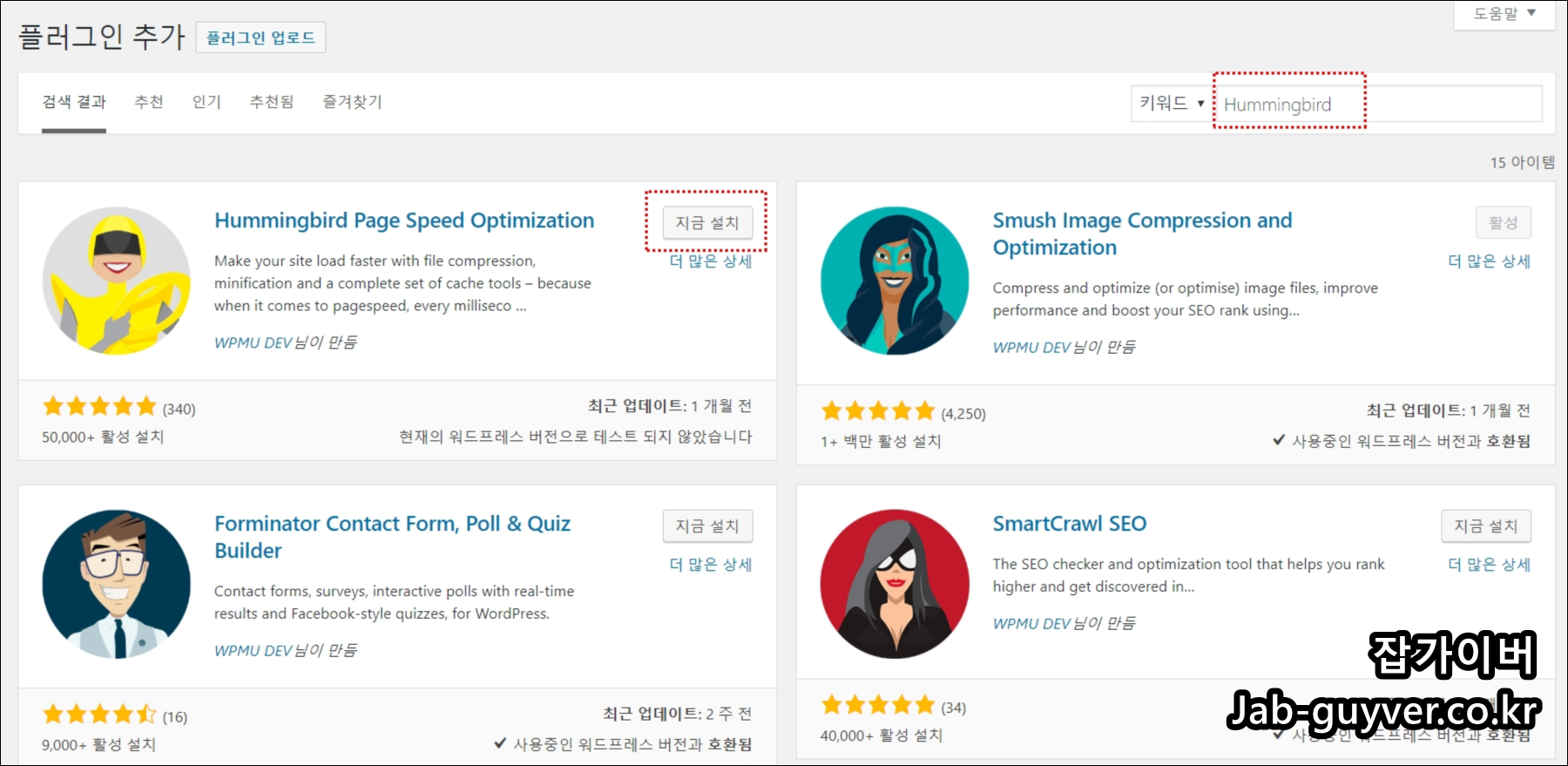 우선 워드프레스에서 Hummingbird Page Speed Optimization설치하고 실행합니다.