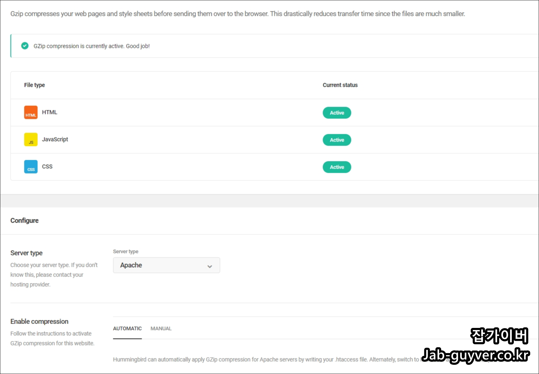 정상적으로 적용되지 않는다면 호스팅 설정(.htaccess) 또는 서버 압축 미지원 가능성도 있습니다.