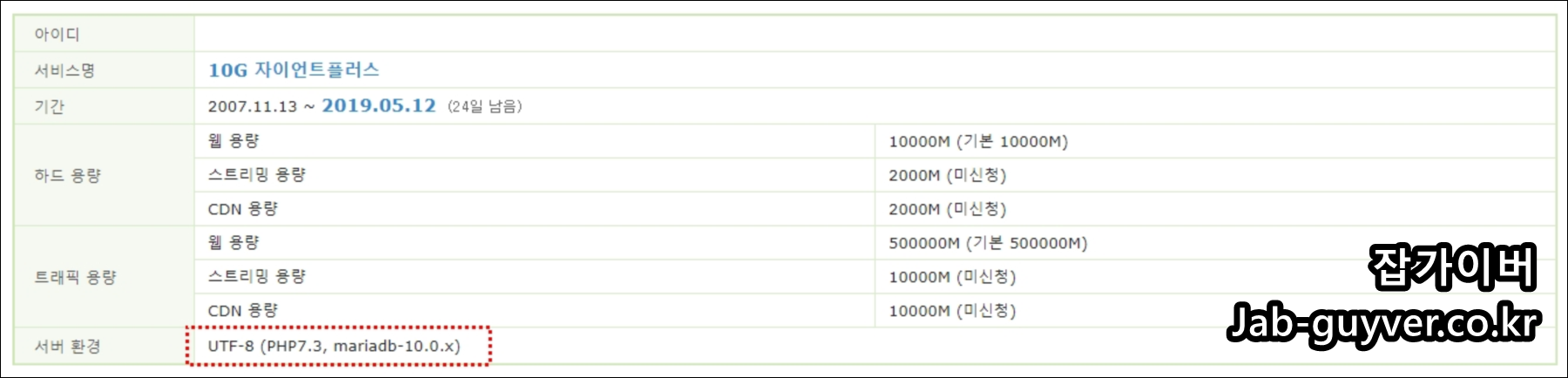 - 그럼 현재 사용중인 서비스를 확인할 수 있으며 하드용량과 트래픽용량등을 확인 현재 서버환경도 확인가능합니다.