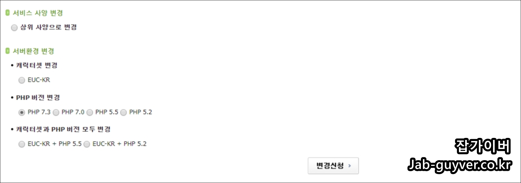 최신버전의 PHP로 변경후 변경신청을 눌러줍니다.