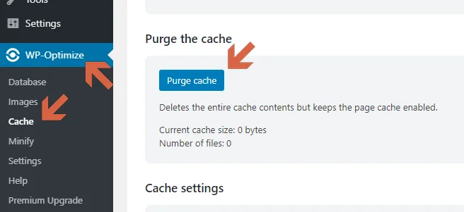 - WP-Optimize > 캐시 > 캐시 설정 비활성화 후 테스트