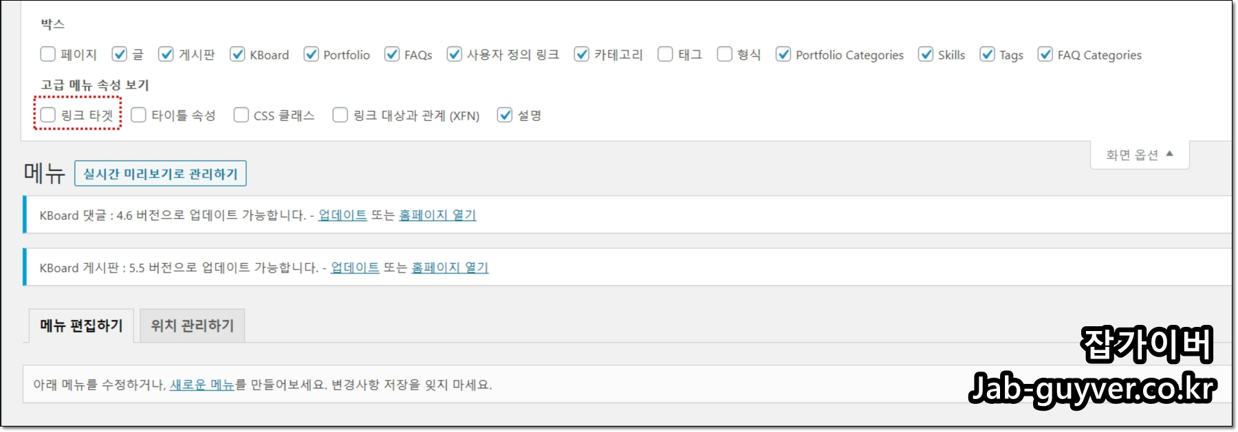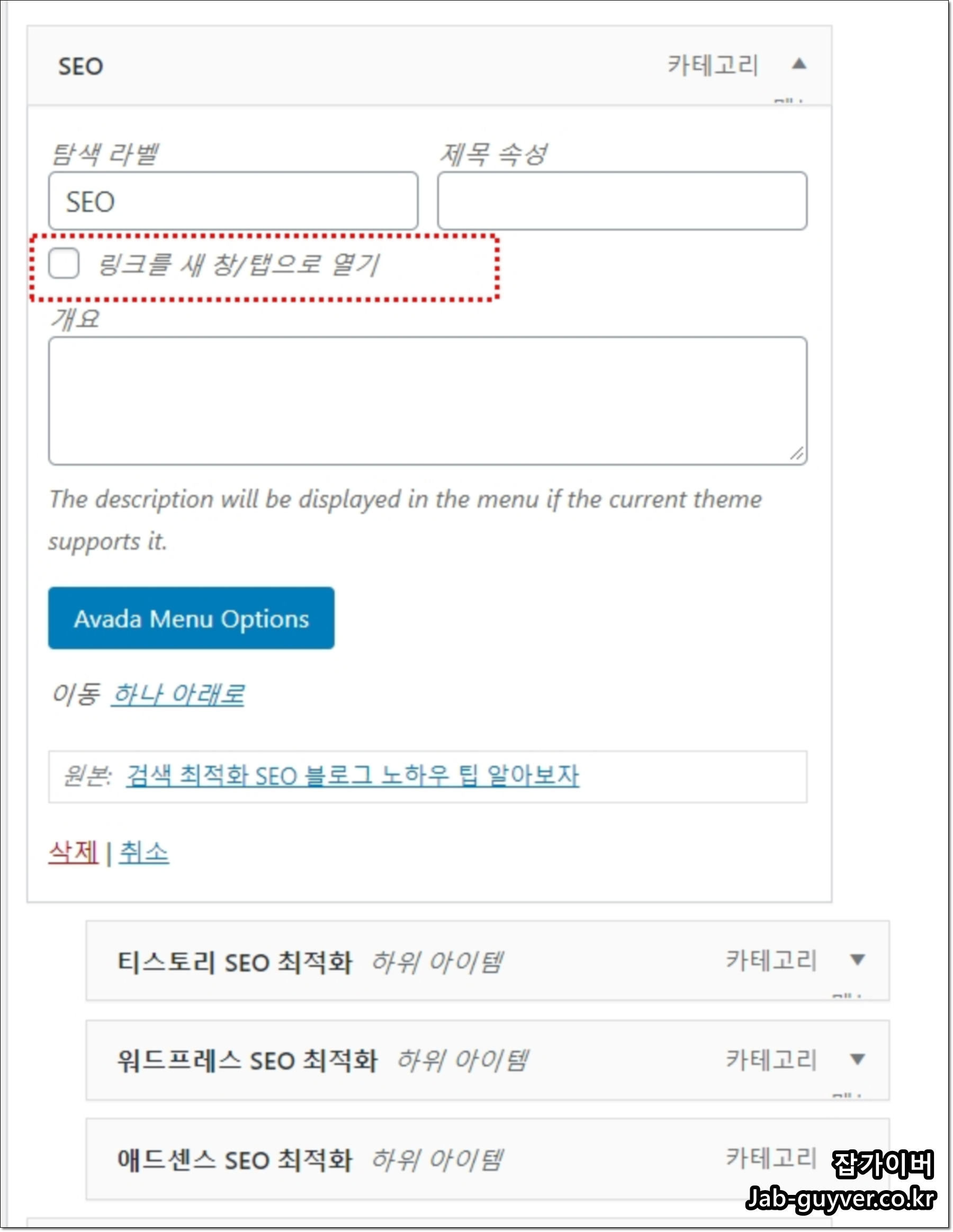 그리고 카테고리 항목에서 링크를 새창 / 탭으로 열기를 체크합니다.