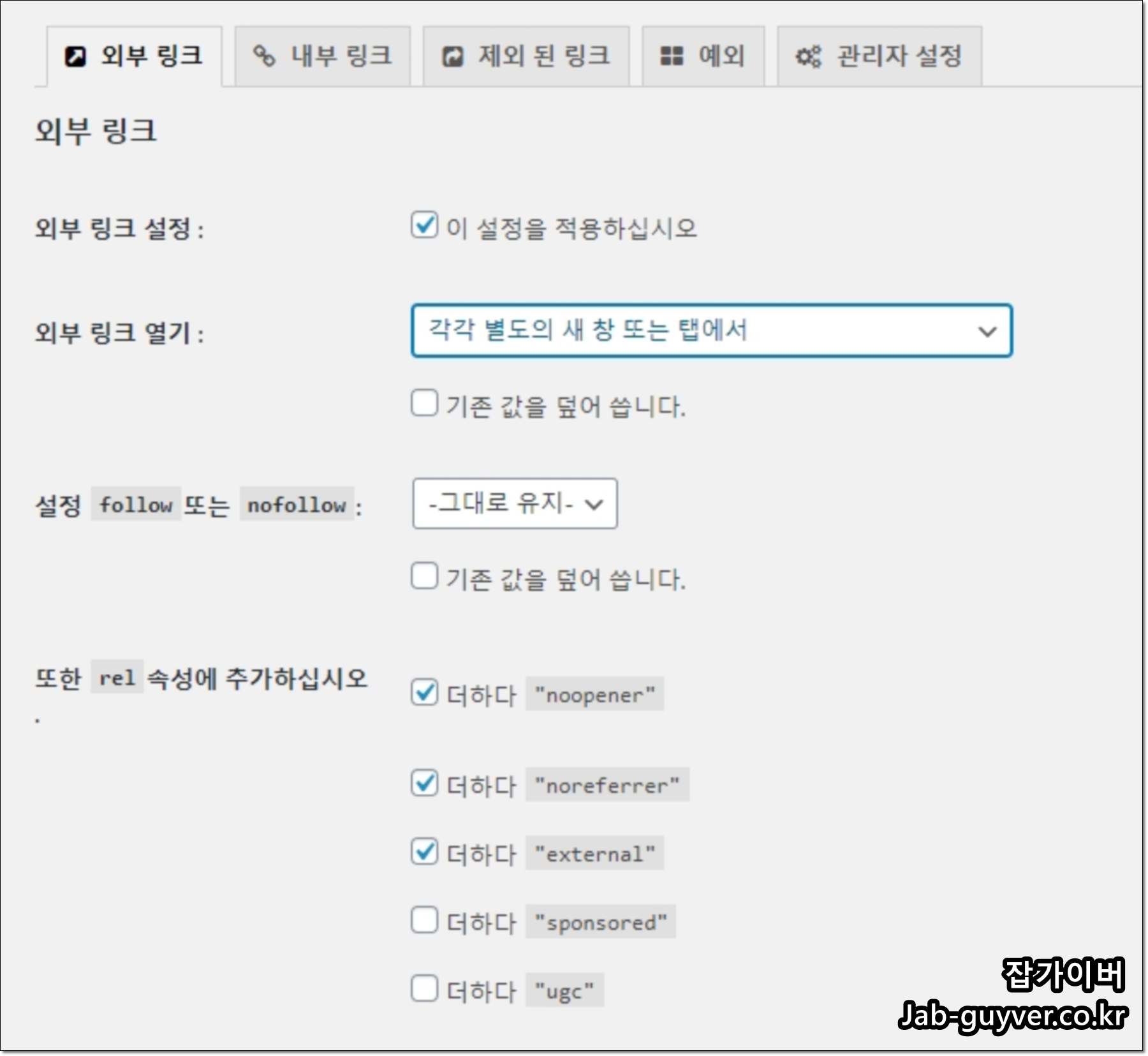 그리고 카테고리 항목에서 링크를 새창 / 탭으로 열기를 체크합니다.