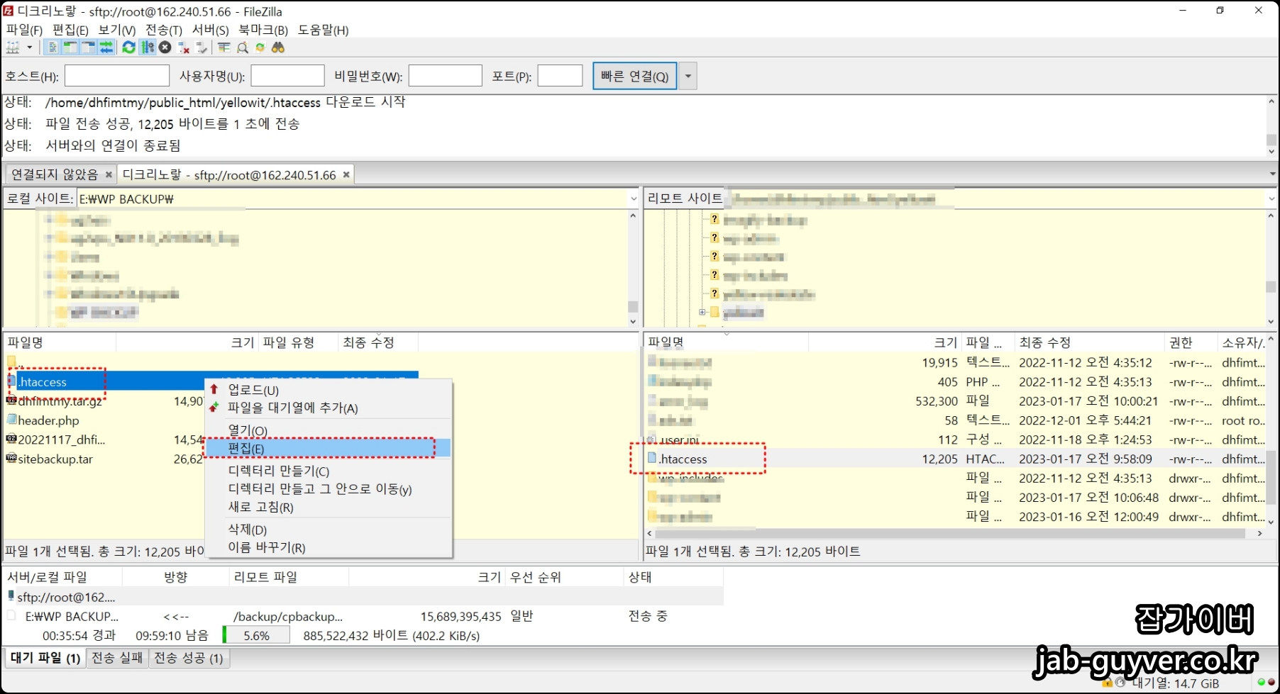 현재 압축되지 않은 상태로서 파일질라등을 통해 FTP 접속 후 .htaccess 파일을 수정합니다.