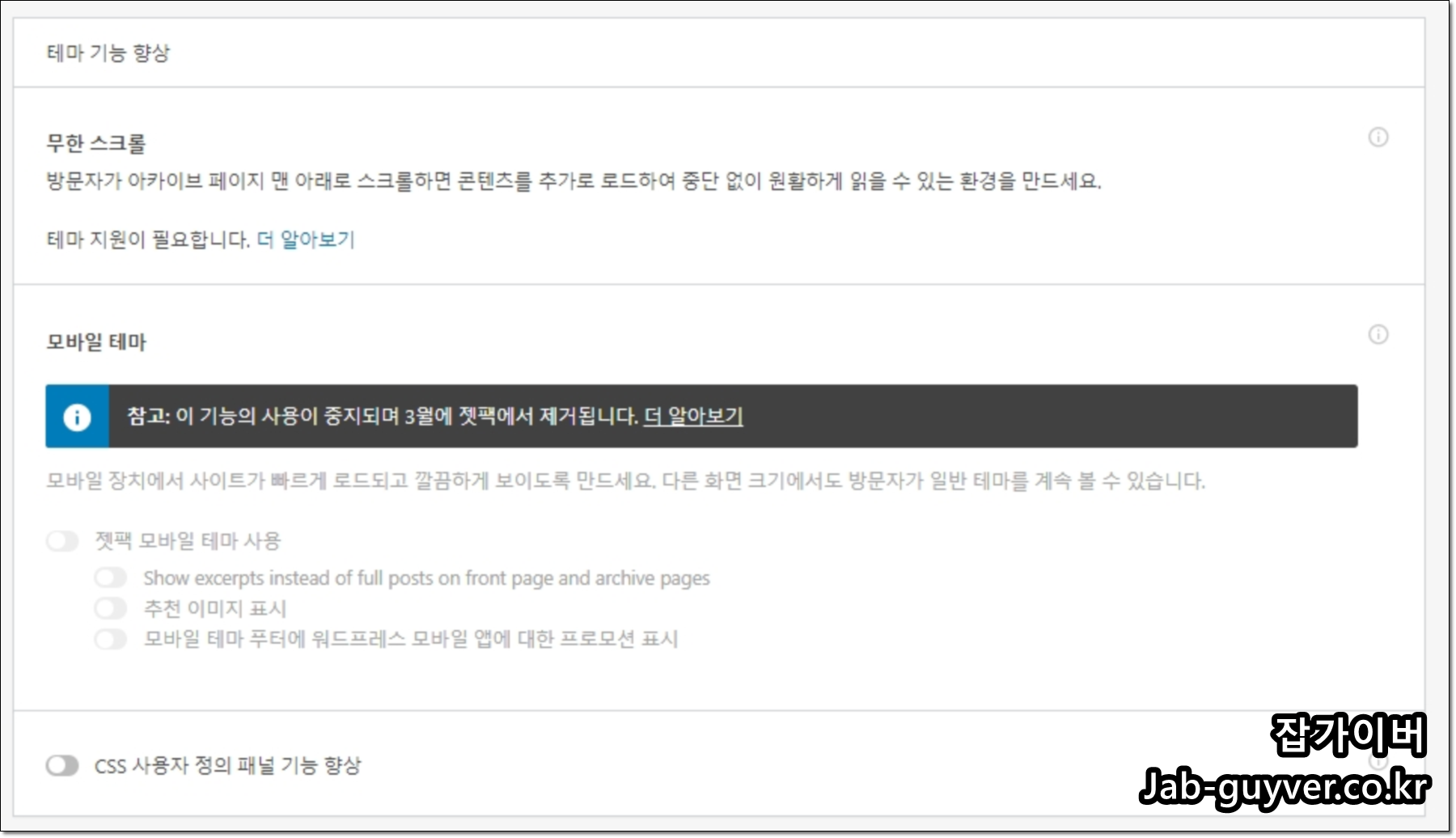 워드프레스 무한스크롤 기능을 활성화하면 마우스를 스크롤할대마다 추가로 로드해서 사용자로 하여금 부드러운 느낌과 함께 홈페이지 이미지 로딩을 순차적으로 하기때문에 무한스크롤 기능은 사용하는것을 추천합니다.