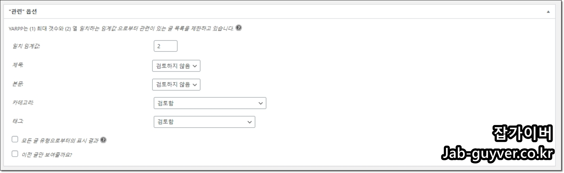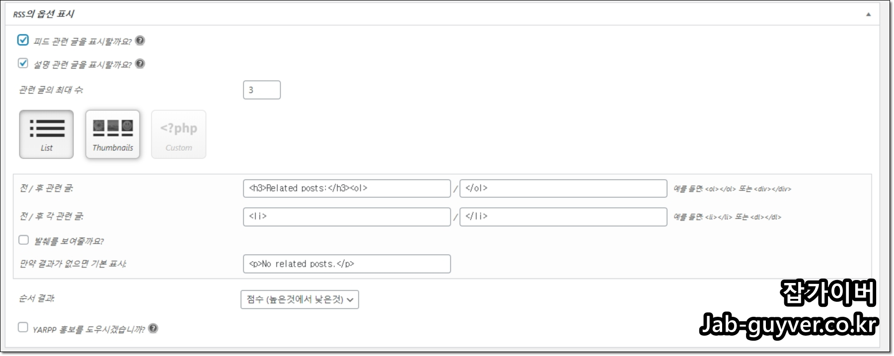 - 템플릿 : YARPP 템플릿 시스템을 사용하면 결과가 어떻게 표시되는지 고급 제어