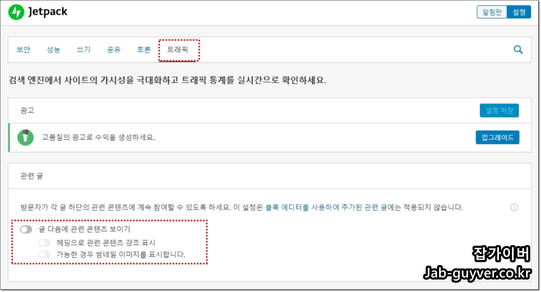 다음은 국민 플러그인인 제트팩(jetPack)의 트래픽 향상을 시켜주는 부분에서 관련된 콘텐츠를 설정할 수 있습니다.