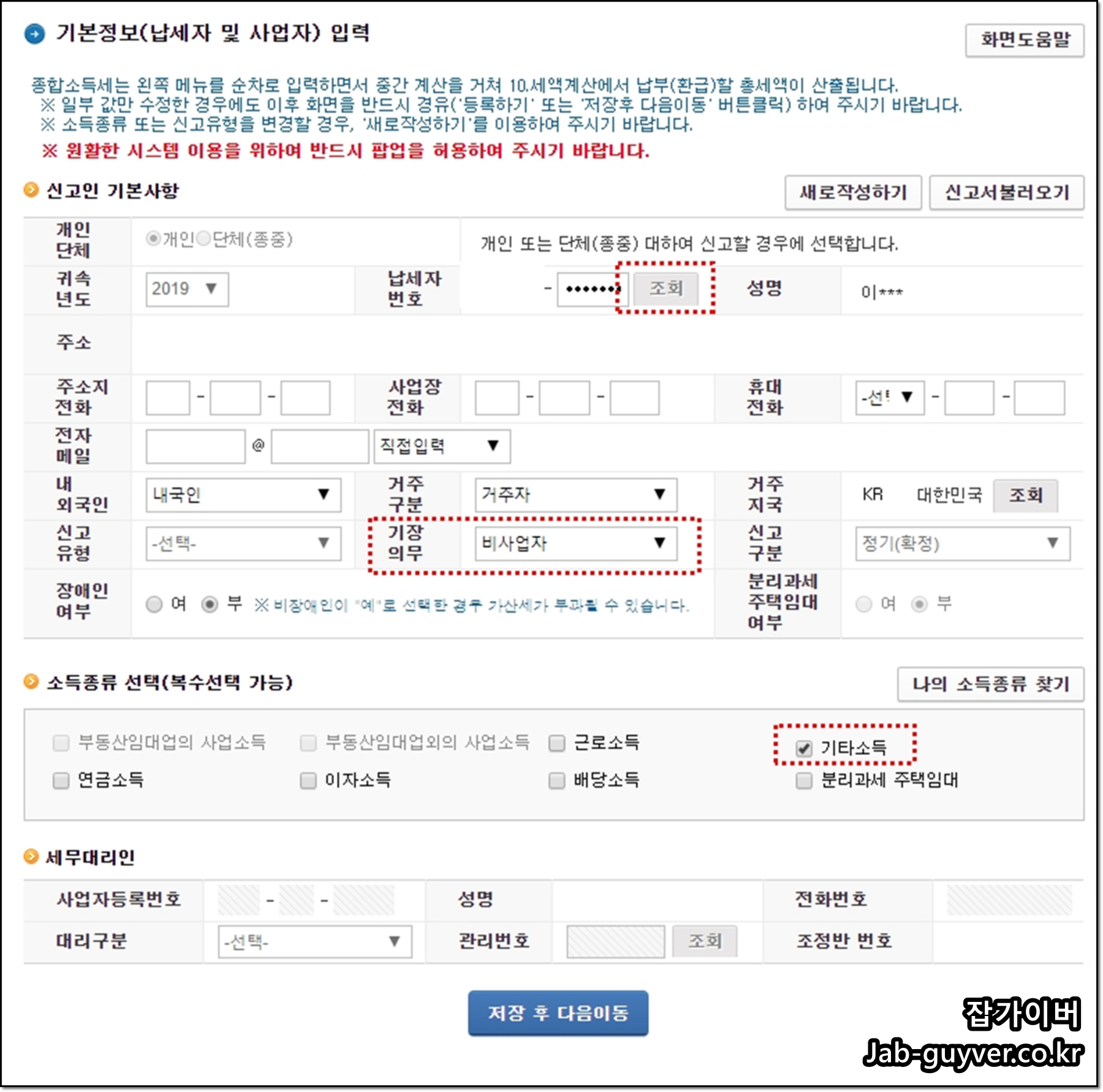 - 기장의무는 사업자가 아니라면 "비사업자"로 선택합니다.