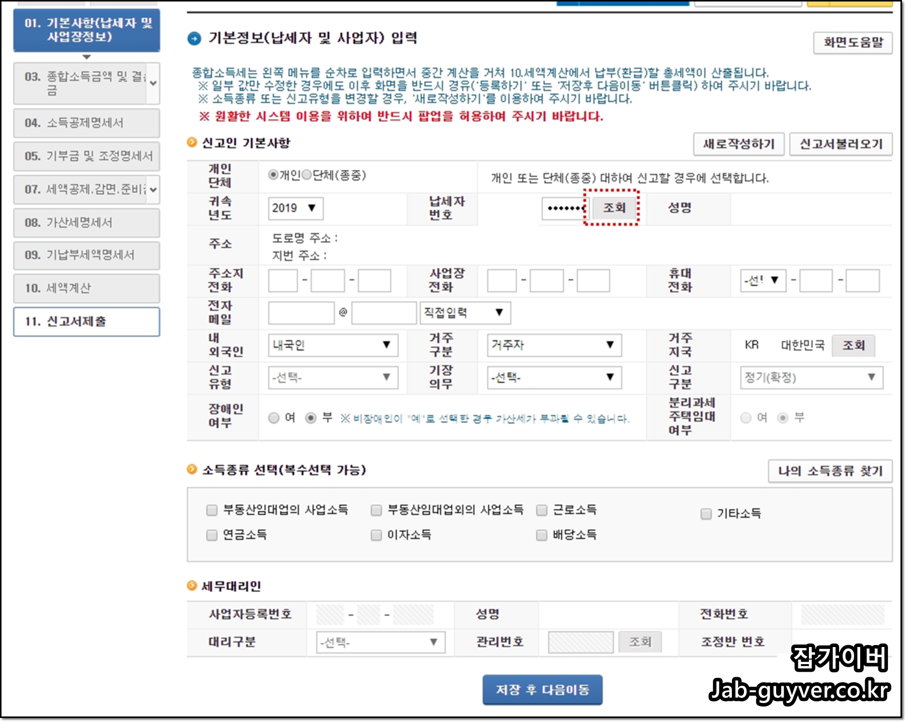 그리고 납세자번호에 주민번호가 자동으로 등록이 되어 있으며 "조회"버튼을 클릭합니다.