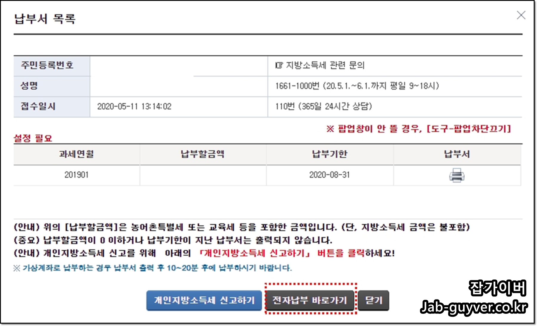 그리고 납세자번호에 주민번호가 자동으로 등록이 되어 있으며 "조회"버튼을 클릭합니다.