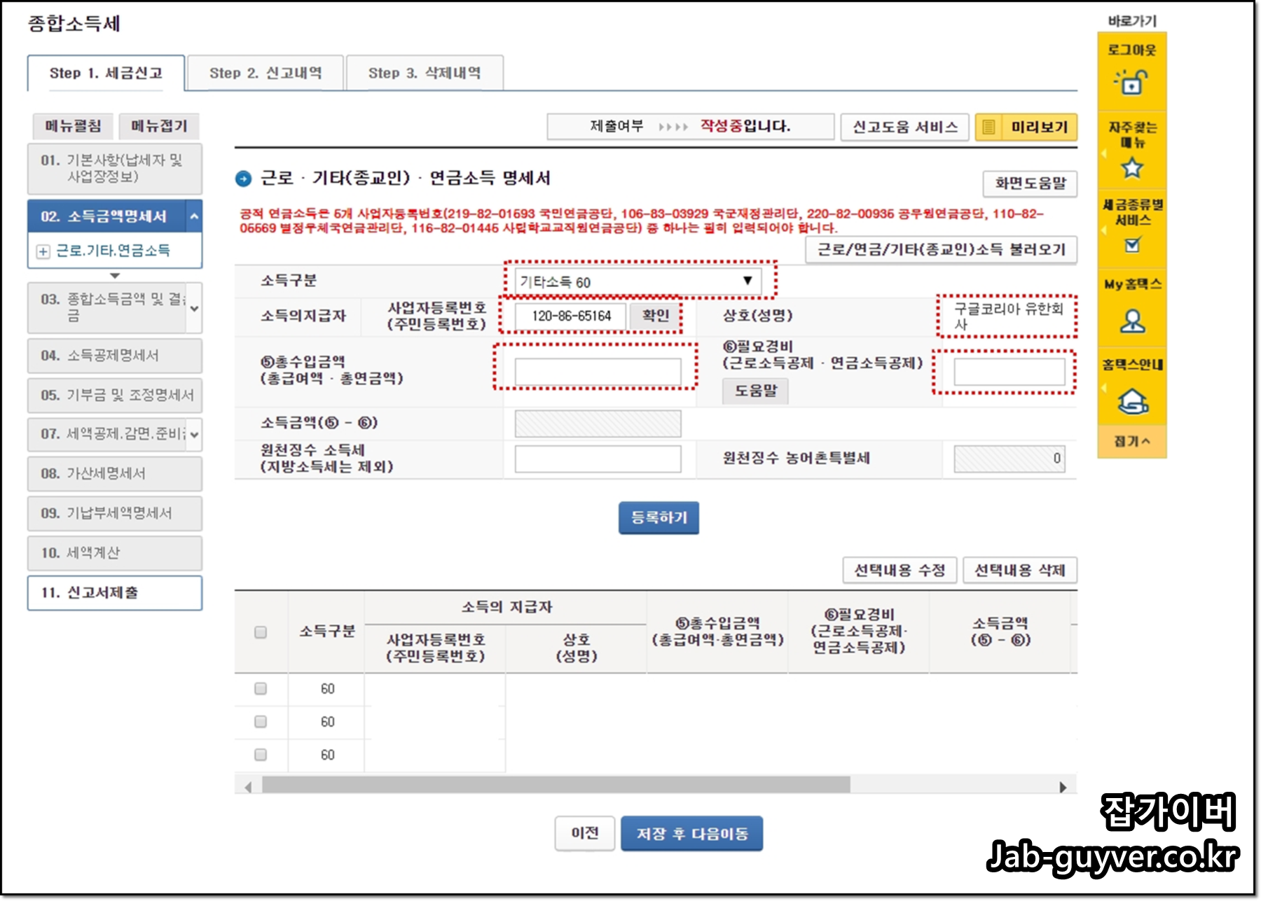 애드센스의 경우는 소득구분을 "기타소득 60"으로 선택합니다.
