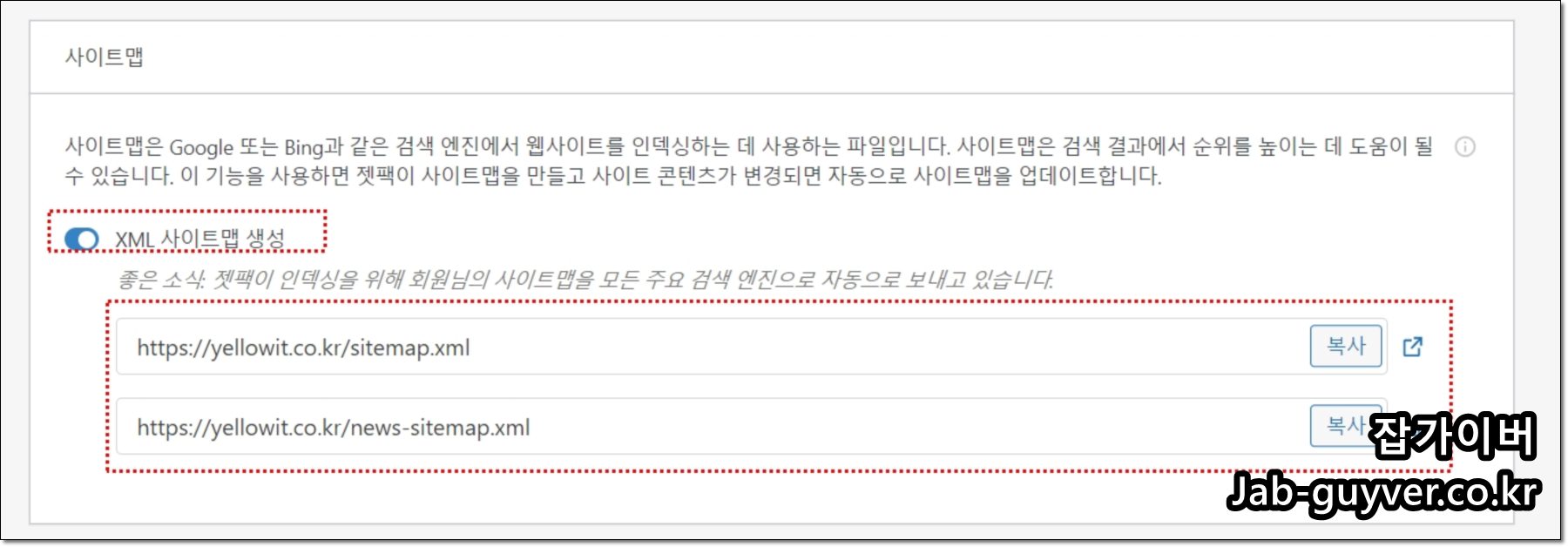 XML 사이트맵 생성을 체크하면 2개의 사이트맵이 생성됩니다.