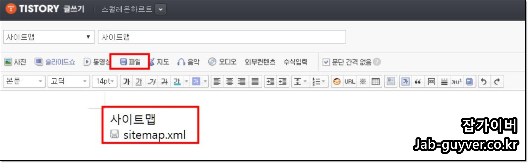이후 티스토리나 워드프레스 등 다운로드한 사이트맵을 파일로 업로드합니다.