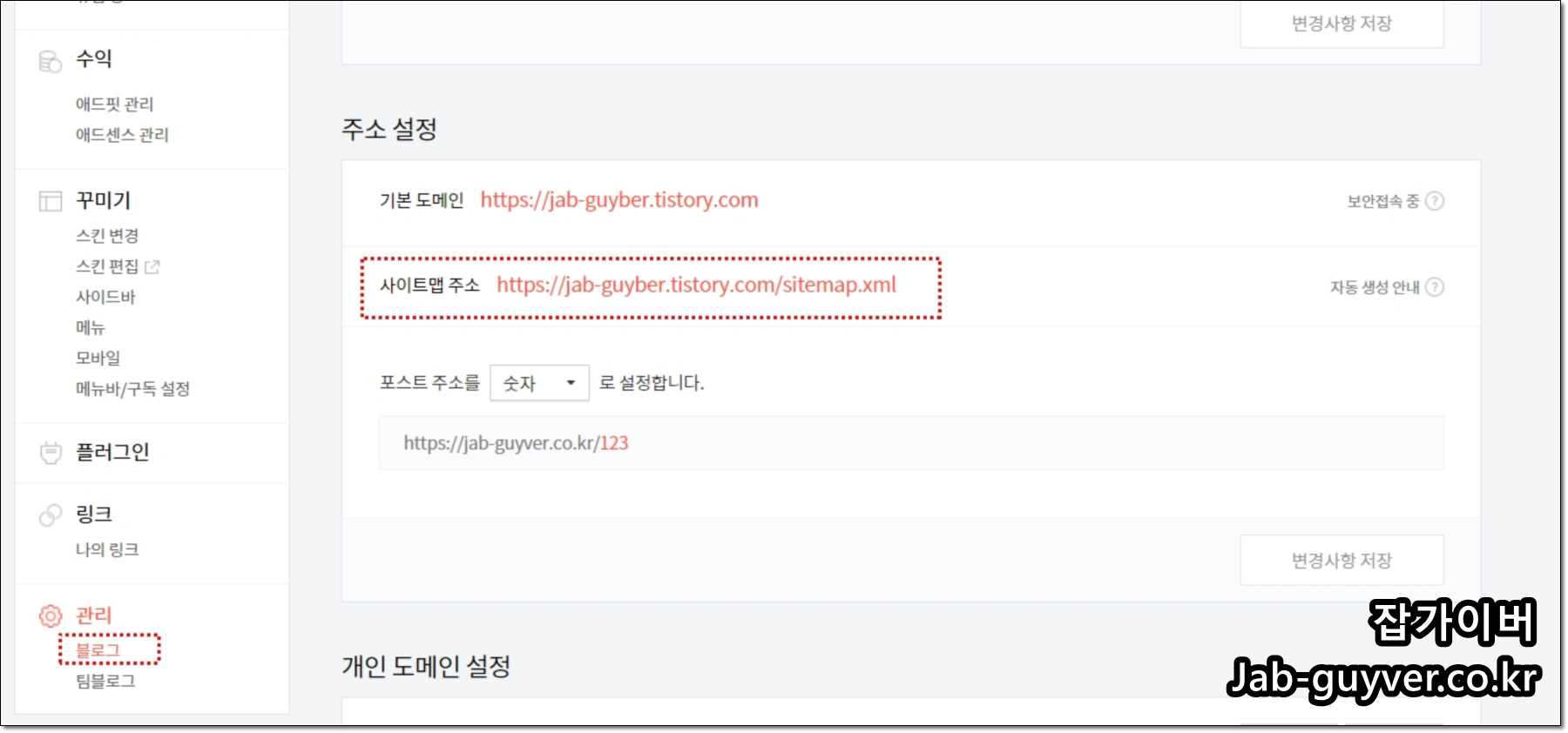 하단에 주소 설정 -> 사이트맵 주소를 확인합니다.