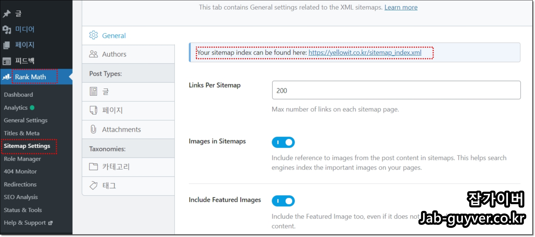 그 외에도 랭킹 매스 플러그인을 사용하면 이미지와 카테고리,링크에 대한 사이트맵을 별도로 추가할 수 있는 장점이 있습니다.