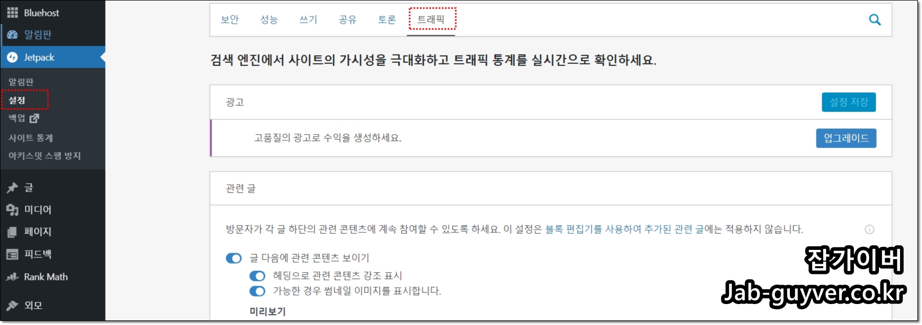 젯팩 -> 설정 -> 트래픽을 선택합니다.