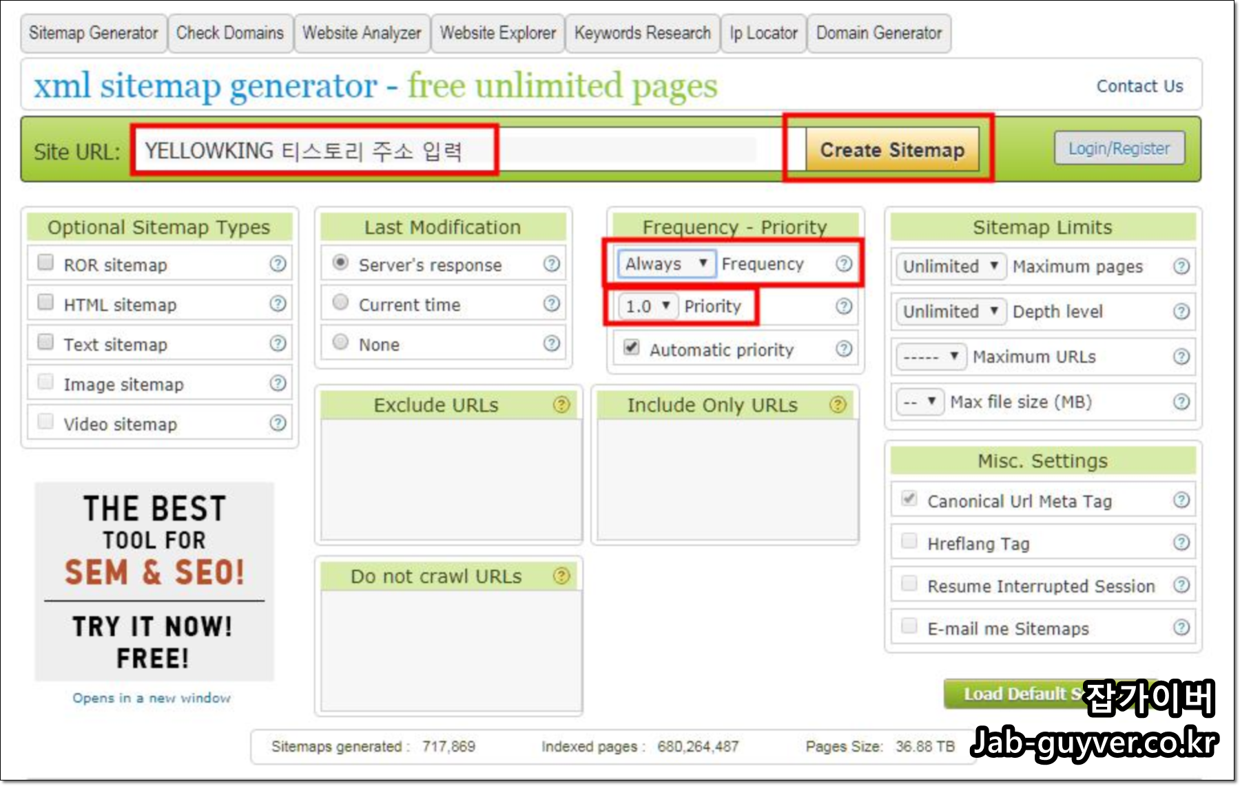사이트맵은 무료와 유료로 만드는 곳이 있는데 무료로 사이트맵을 만드는 사이트로서 비교적 빠른 속도로 만들어집니다.