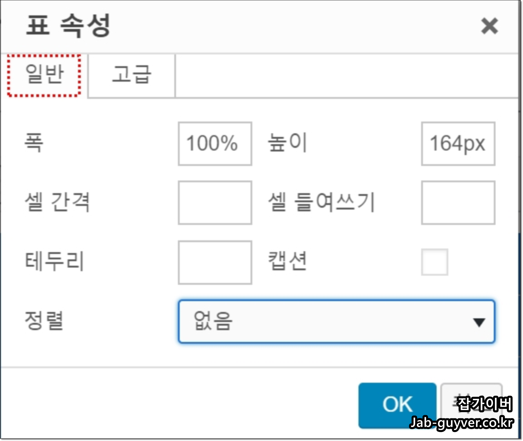 요즘처럼 모바일 접속이 많은 환경에서는 고정 폭(px)보다는 100% 또는 90% 정도의 비율로 두는 편이 화면마다 자연스럽게 맞춰져 보기 좋습니다. 나머지 셀 여백, 들여쓰기, 테두리 두께, 캡션(설명), 정렬 등은 속성 창의 일반 탭에서, 테두리 스타일이나 색상, 배경색 등은 고급 탭에서 세세하게 조정할 수 있습니다.