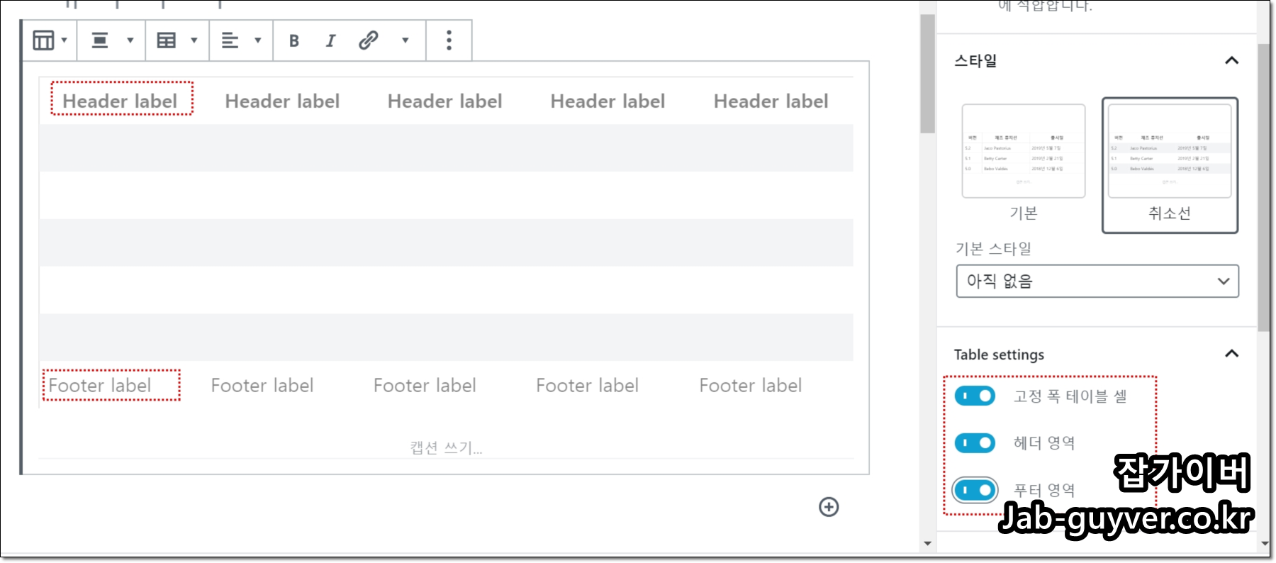 또, 표 전체를 고정 폭 테이블로 만들지, 화면 크기에 따라 너비가 자연스럽게 늘어나는 구조로 둘지 선택할 수 있고, 헤더 영역과 푸터 영역, 캡션(표 제목)을 따로 둘 수도 있습니다.