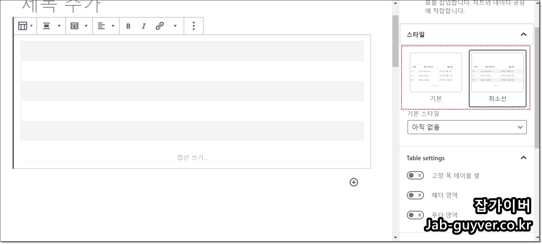 행마다 배경색을 번갈아 넣을 수 있는 스타일도 있고, 특정 내용에는 취소선이나 강조를 넣을 수 있어서 간단한 비교표를 만드는 데에는 충분히 쓸 만합니다.