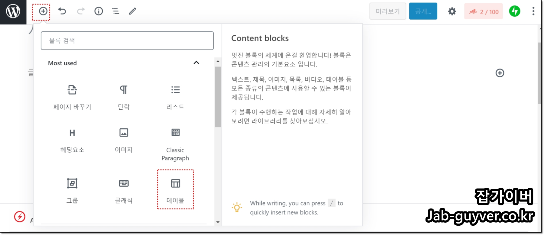 먼저 워드프레스에서 기본으로 제공하는 Table 블록을 어떻게 쓰는지부터 간단히 짚고, 그다음에 TinyMCE Advanced로 부족한 부분을 채우는 흐름으로 정리해 볼게요.