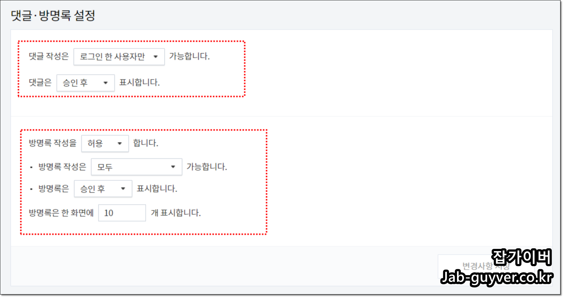 그 외에 설정을 통해 댓글과 방명록을 설정할 수 있습니다.
