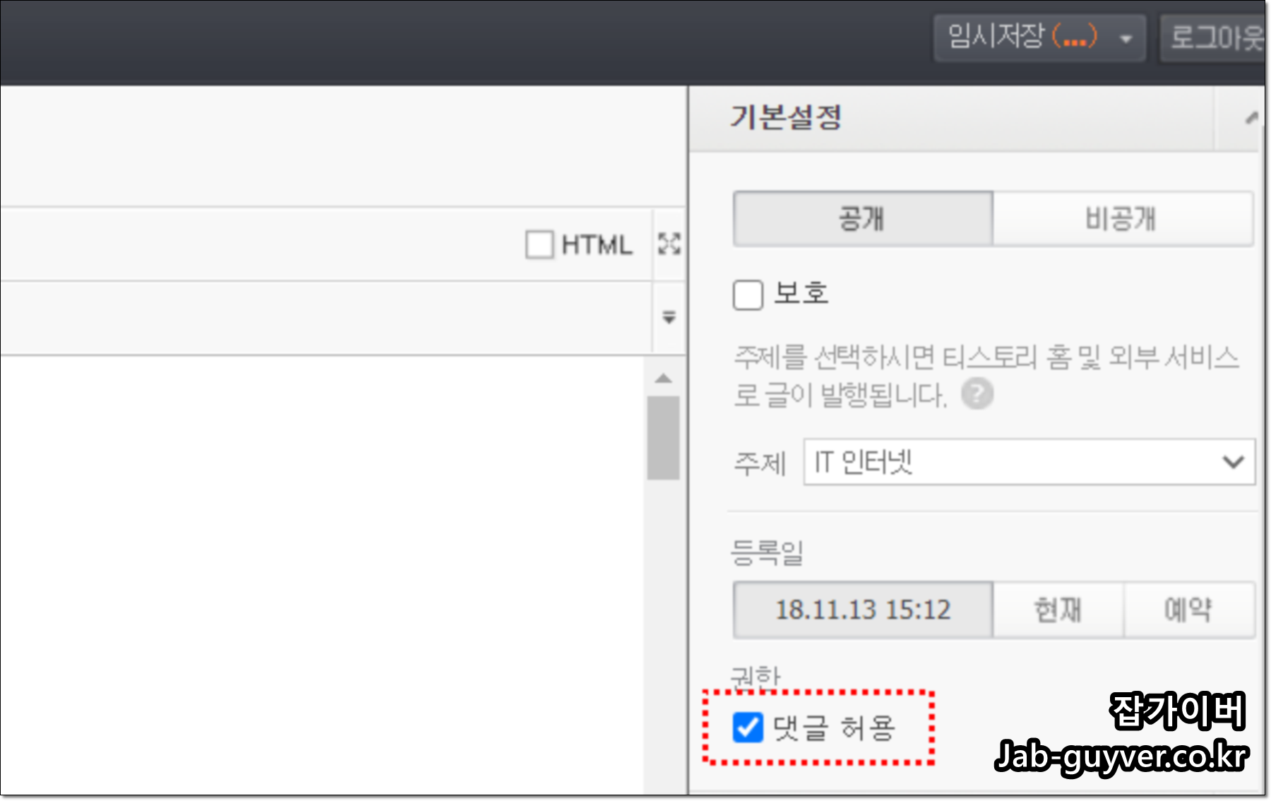 하지만 2020년에 업데이트된 티스토리에서는 발행시 바로 보이는 댓글허용을 선택할 수 있도록 되어있습니다.