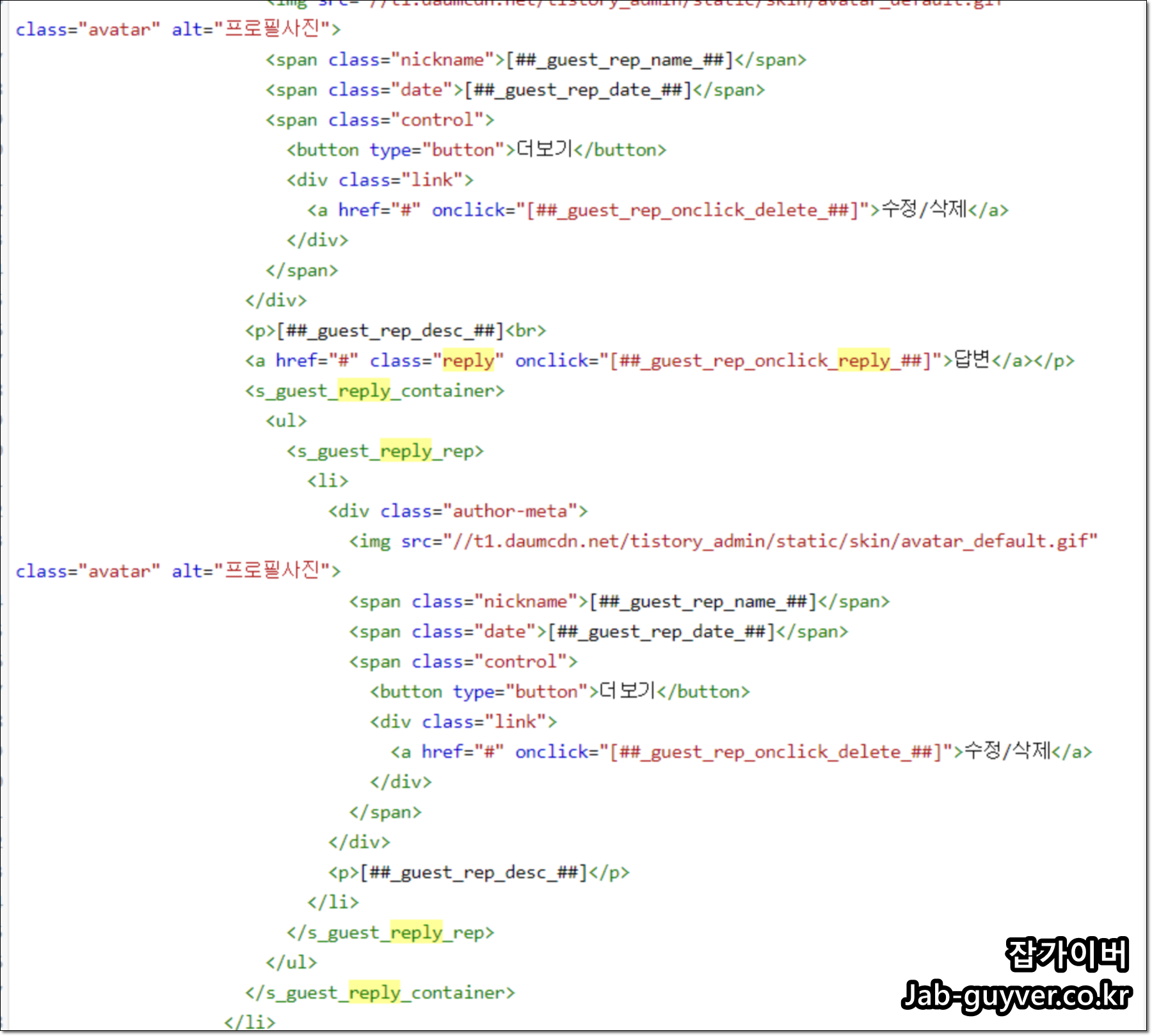 html의 형태는 티스토리 스킨마다 다르기 대문에 html 태그를 reply로 검색해서 해당 태그를 삭제해줍니다.