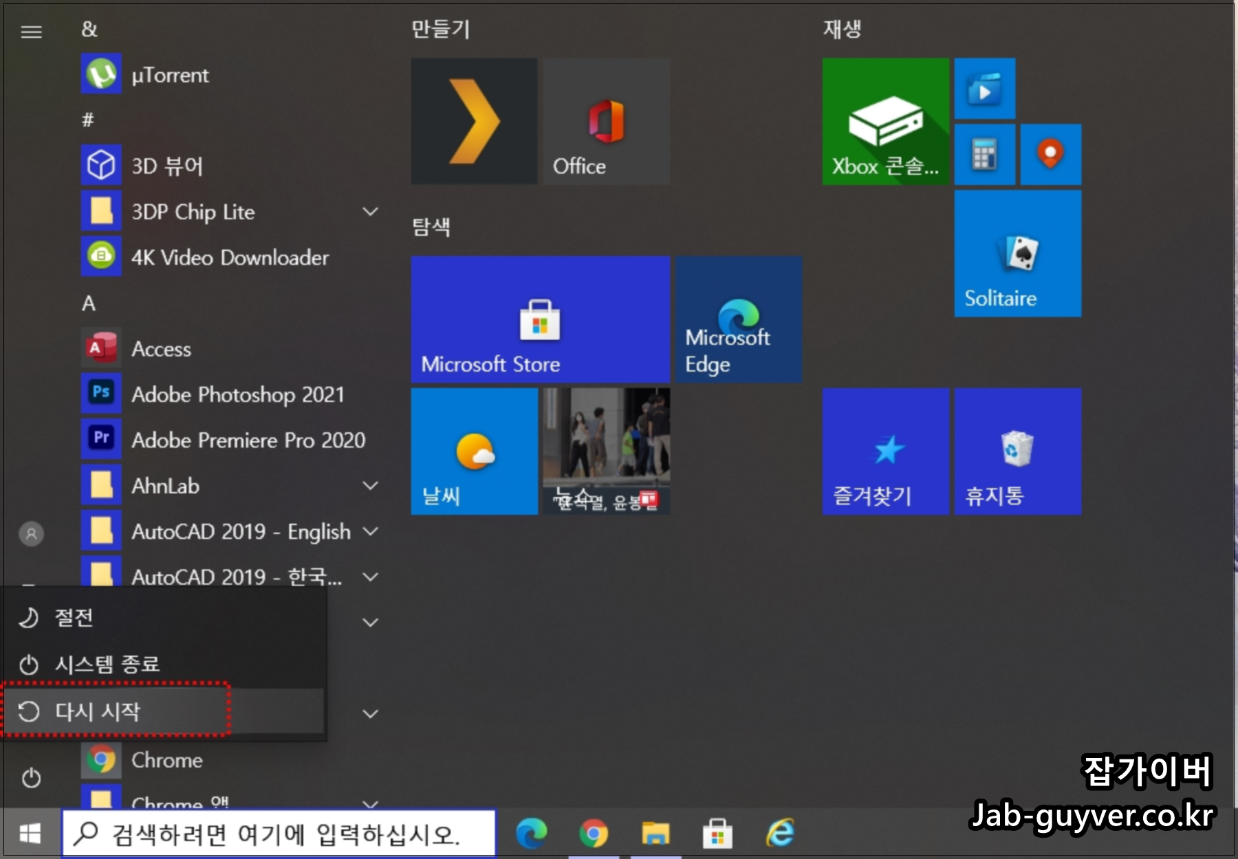 우선 컴퓨터를 재부팅합니다.