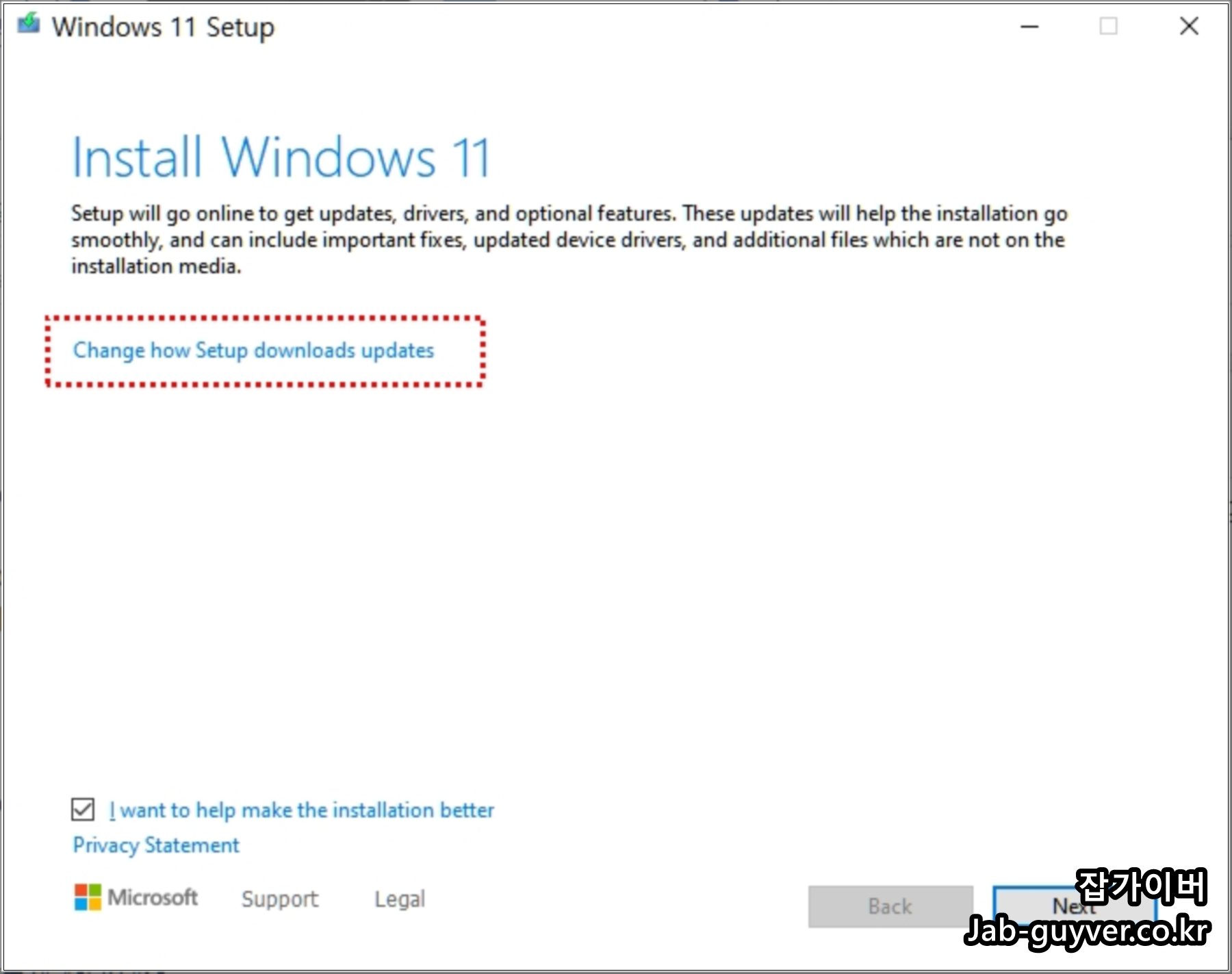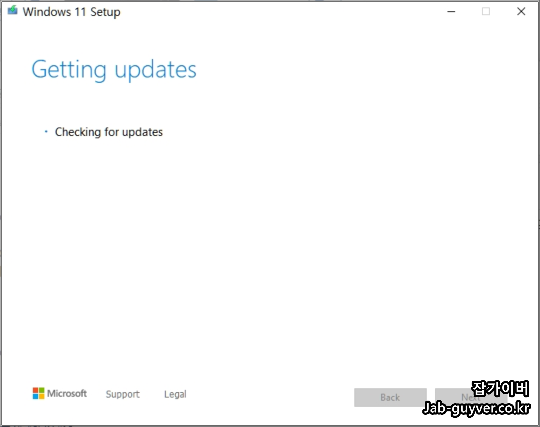 SETUP.EXE 파일을 통해 설치를 진행하게되면 윈도우11 업그레이드 화면이 뜹니다.