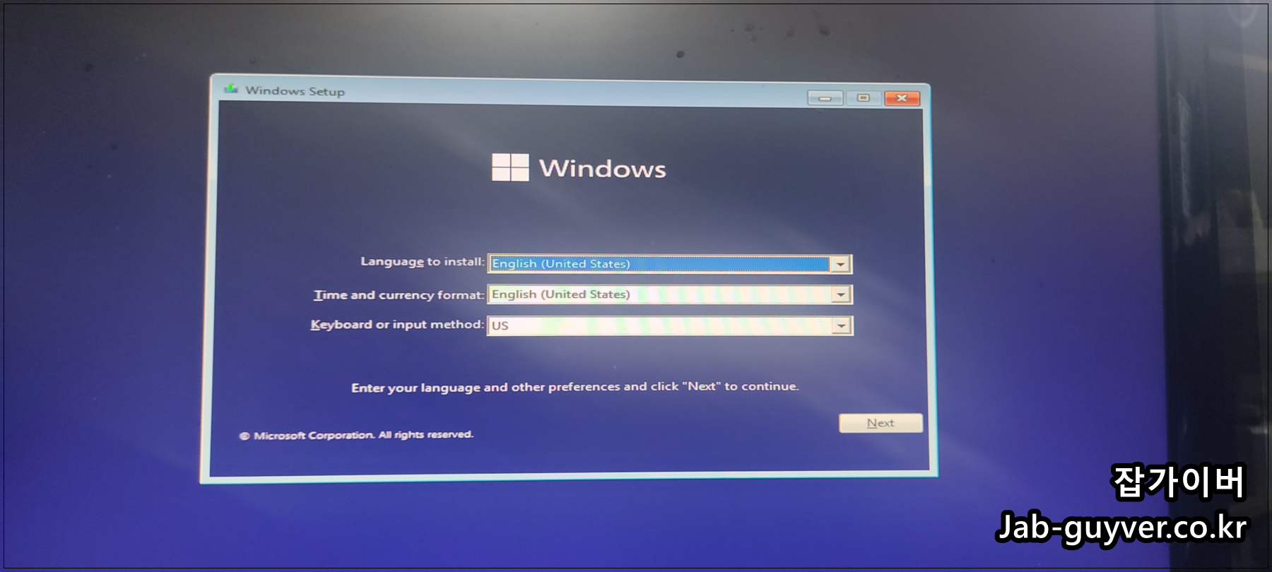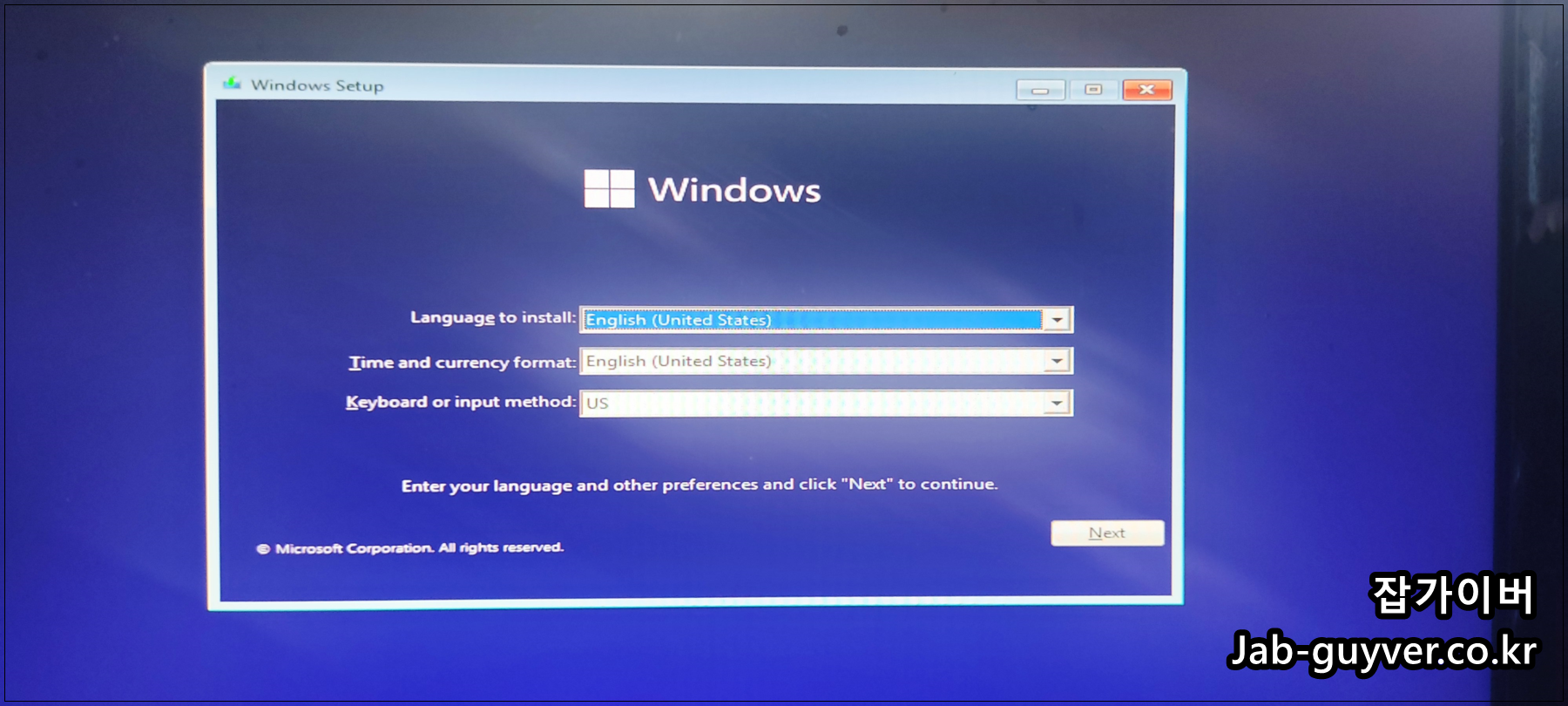 USB 부팅디스크를 삽입 후 재부팅 시 윈도우11 설치화면으로 넘어가집니다.