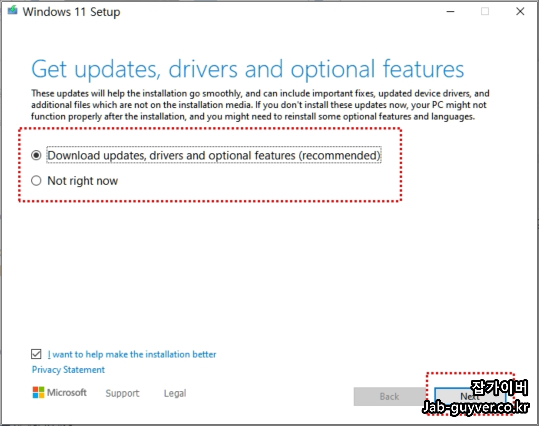SETUP.EXE 파일을 통해 설치를 진행하게되면 윈도우11 업그레이드 화면이 뜹니다.