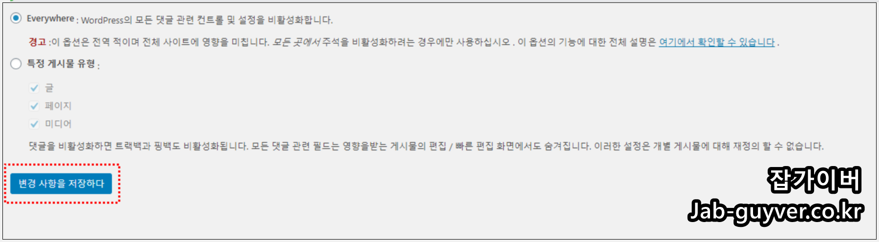 아니면 Everywhere를 선택하면 자신의 모든 워드프레스 댓글을 비활성화 할 수 있습니다.
