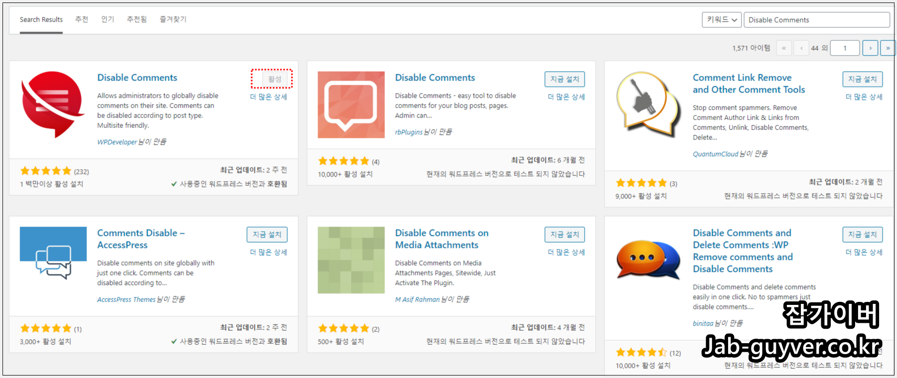 워드프레스 플러그인 명 "Disable Comments"를 검색 후 설치합니다.