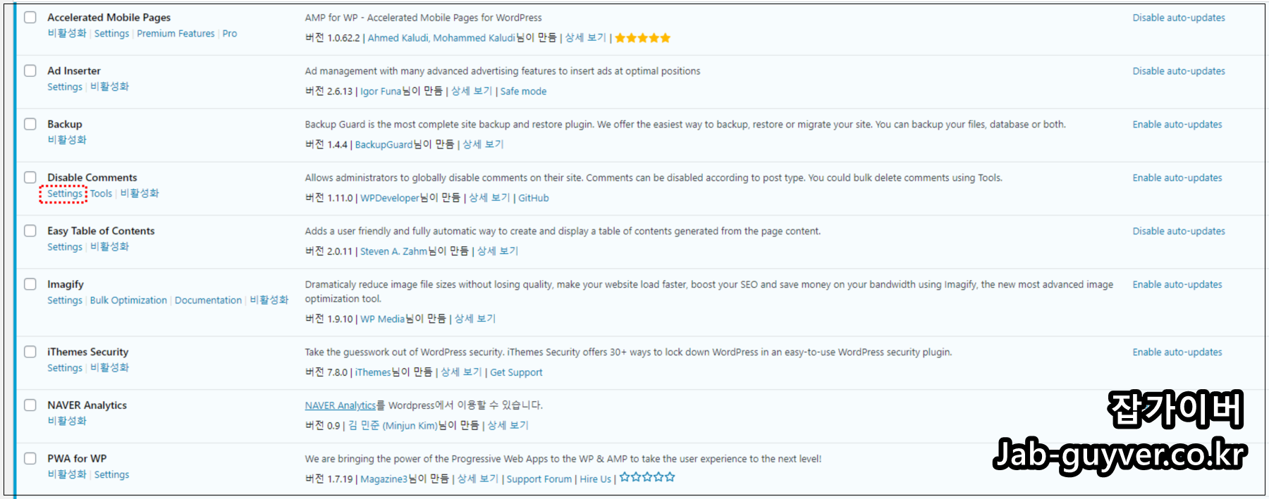 플러그인을 설치하고 난 다음 설정을 통해 댓글을 비활성화 할 수 있습니다.