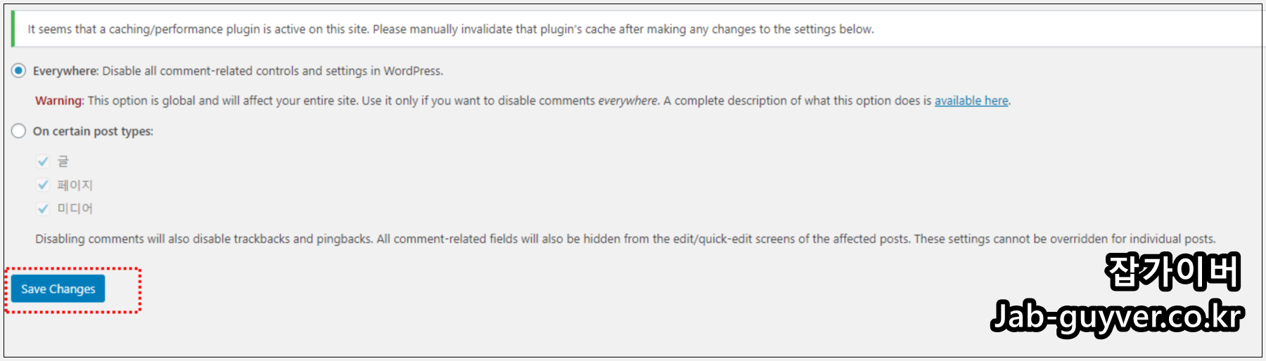 아니면 Everywhere를 선택하면 자신의 모든 워드프레스 댓글을 비활성화 할 수 있습니다.