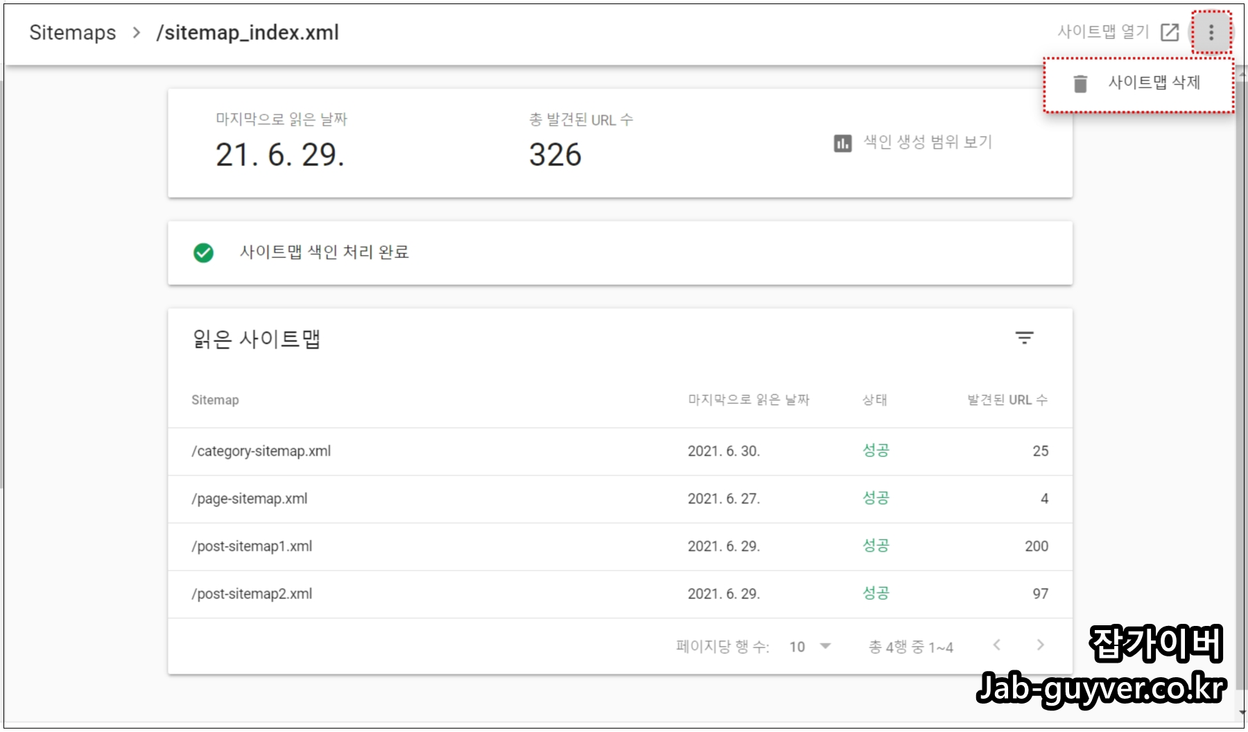 그런데 만약 중복하거나 잘못된 사이트맵을 등록했다면 등록된 사이트맵 삭제해야 합니다.