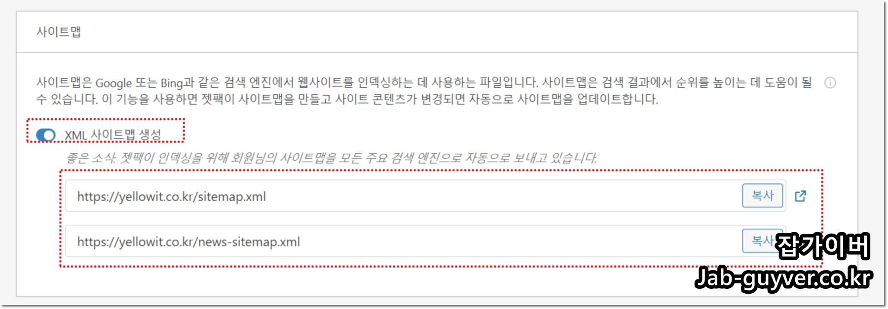 그리고 이번에는 잿팩 "JETPack"에서 제공하는 사이트맵 생성 및 각각의 웹마스터도구 소유권 확인방법을 알아보겠습니다.