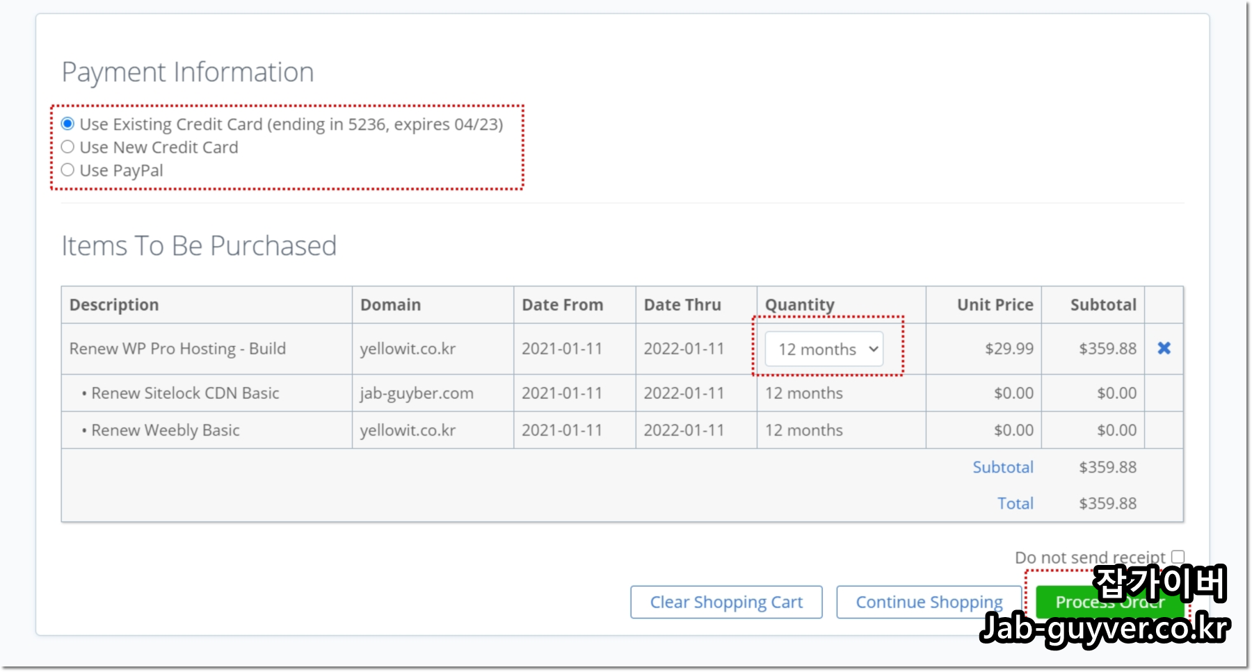 카페24를 통해 워드프레스를 사용하다가 이번에 블루호스트로 호스팅서버를 마이그레이션 하고 사용한지 이제 1년이 지나 유지보수가 만료되어 새롭게 갱신해야하는 시기가 다가왔으며 추가결제를 하거나 자동결제를 통해 매년 자동갱신되도로 유지보수를 설정할 수 있습니다.