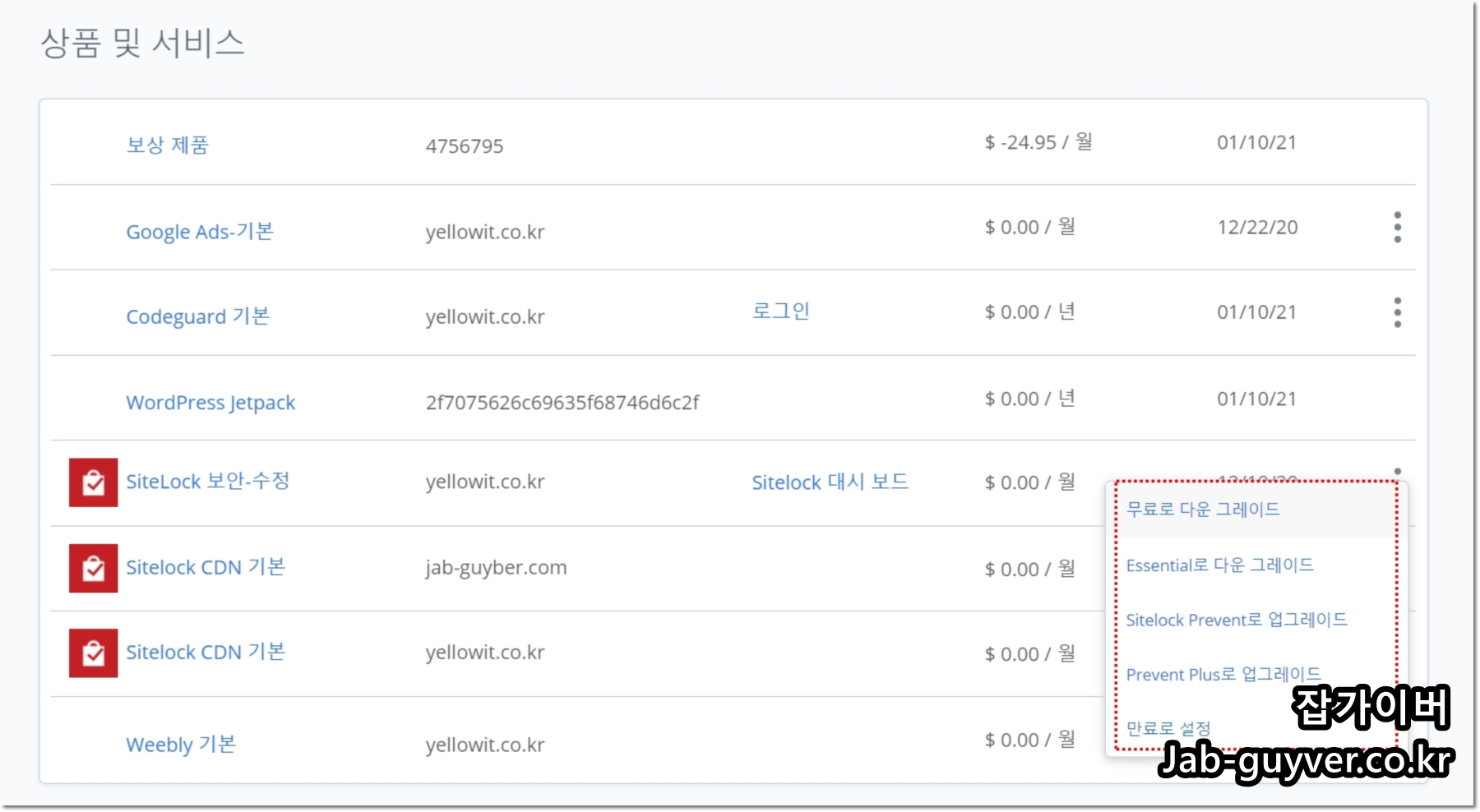 아래로 내리면 현재 서비스 중인 블루호스트 상품을 확인할 수 있으며 해당 서비스를 다운로그레이드하거나 업그레이드,만료처리 "결제취소"를 할 수 있습니다.