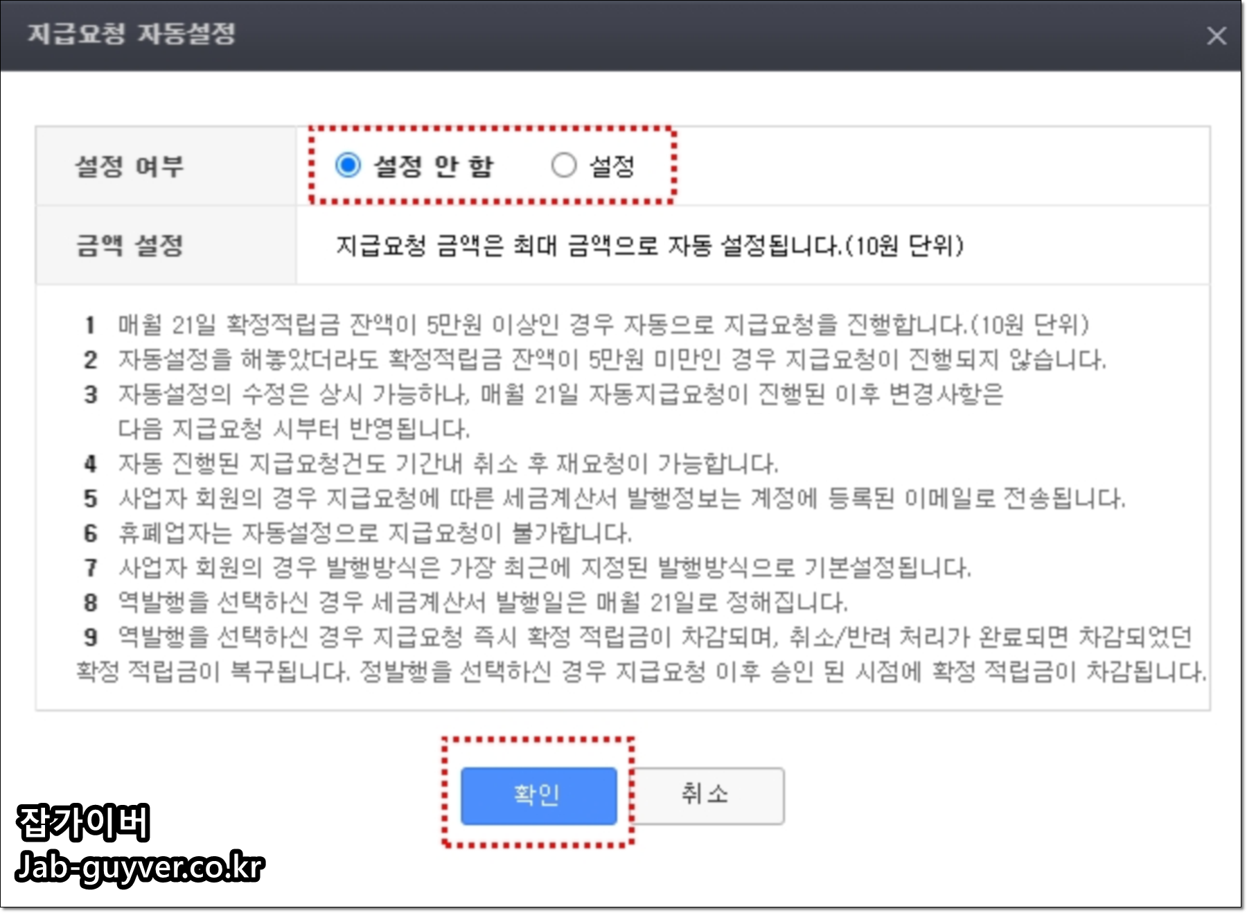 이후 지급요청 자동설정을 통해 매월 21일 잔액이 5만원 이사이면 자동으로 10원단위로 이체가 됩니다.