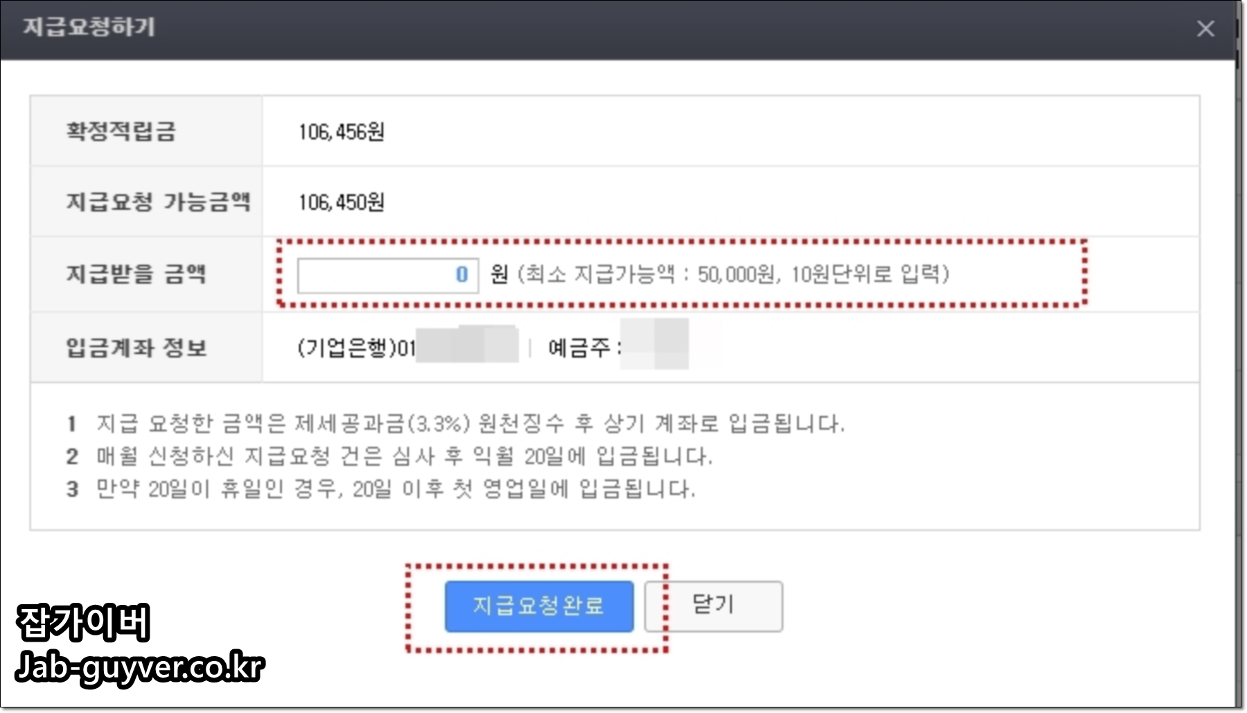 입금계좌와 예금주를 확인 후 최소 지급가능액인 5만원 이상 10원단위로 입력합니다.